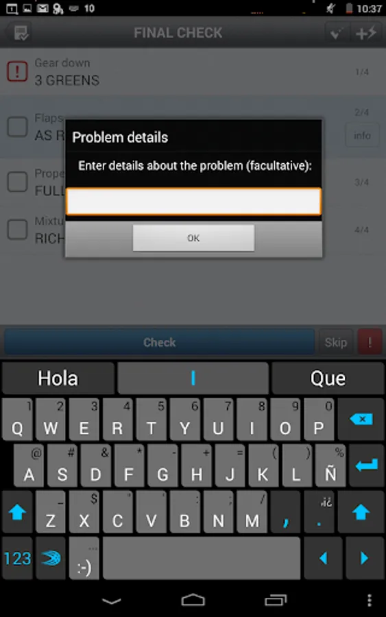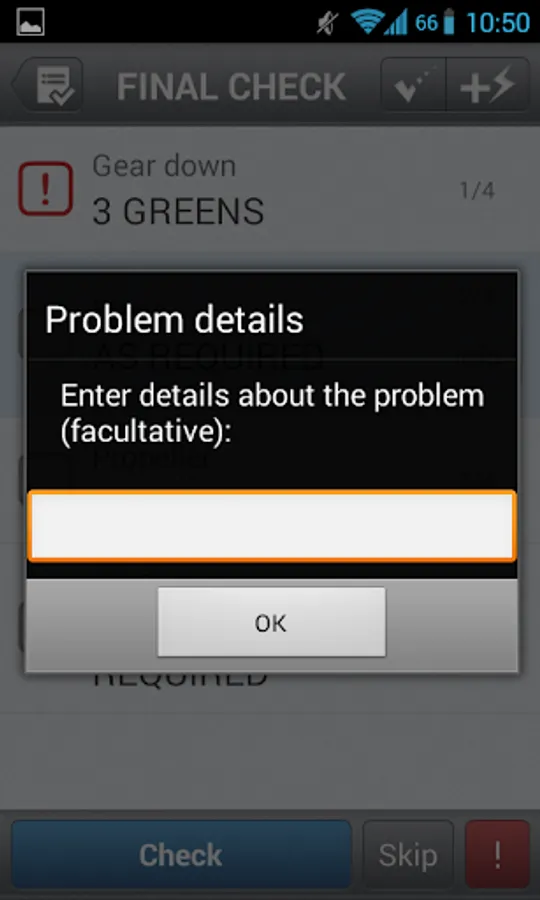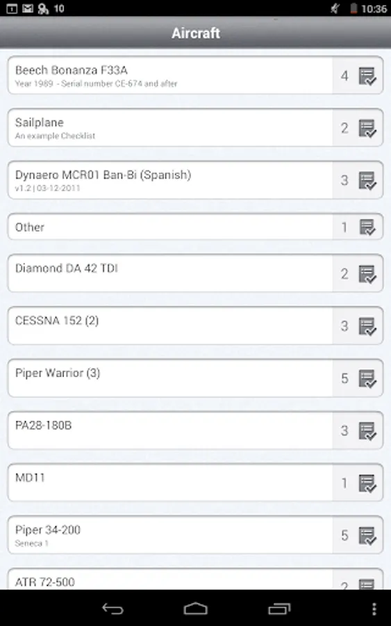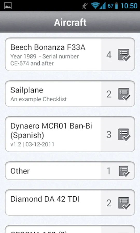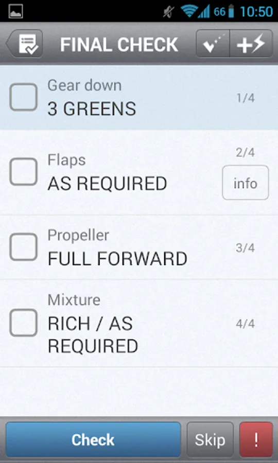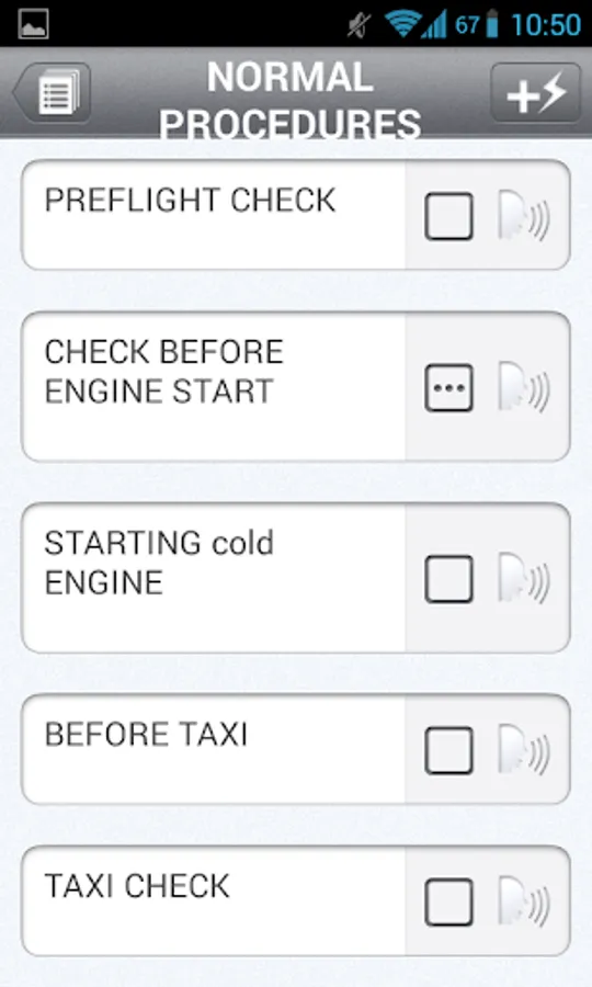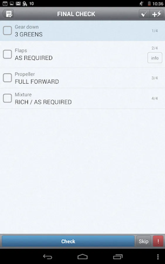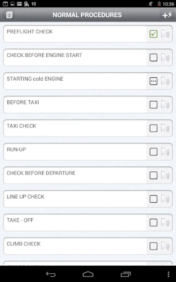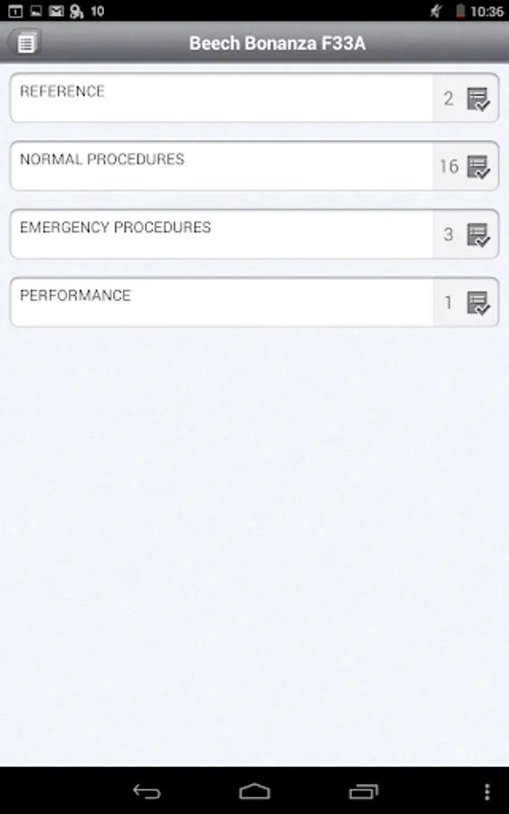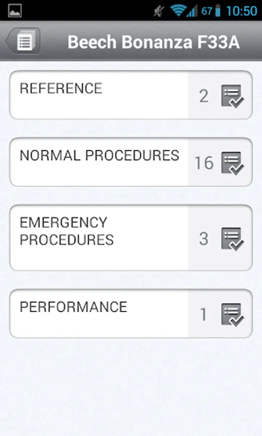 The graphical interface is very simple and easy to read in the plane. The checklists are organized in four levels. No other app in the market has four levels, needed in aviation.