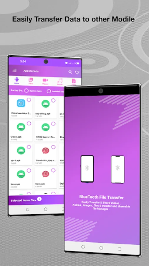 Bluetooth file transfer and share apk between different devices through wireless connectivity. Bluetooth wireless technology provides the way to access device files between each other and transfer over a short distance. Bluetooth transfer audio files, transfer and share video files and share documentation and zip files and all kinds of apps which you demand from another mobile device. If your friend likes some apk on your mobile device so you easily share apks of that product through this Bluetooth file sender. Bluetooth sender selects a complete folder and transfers to other mobile easily.