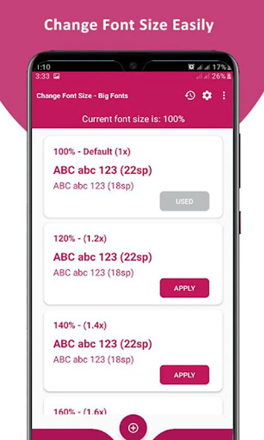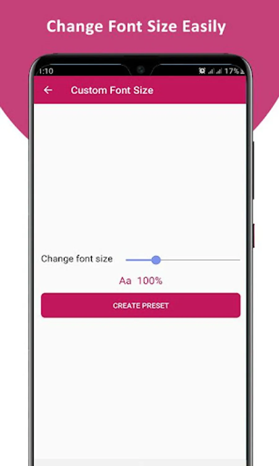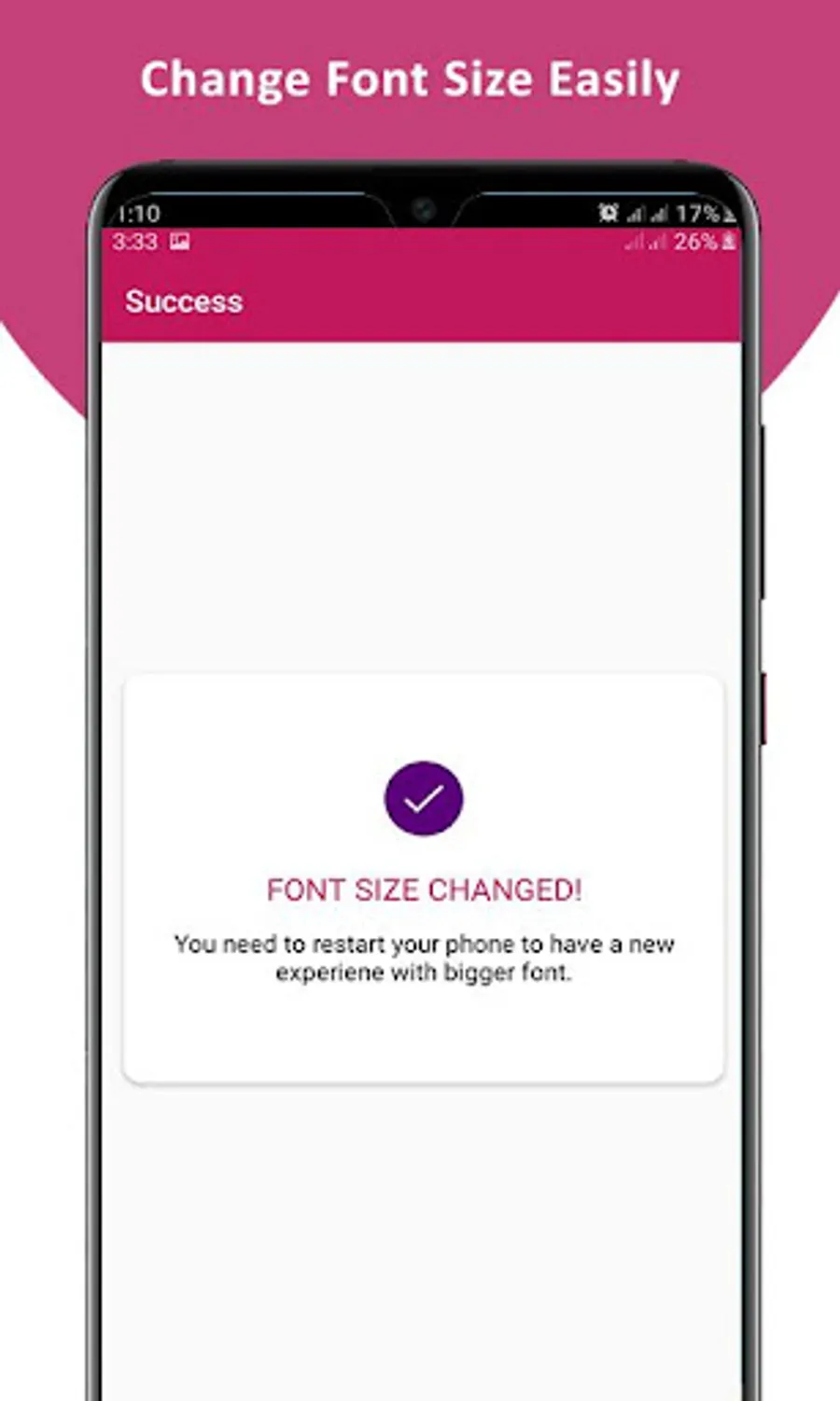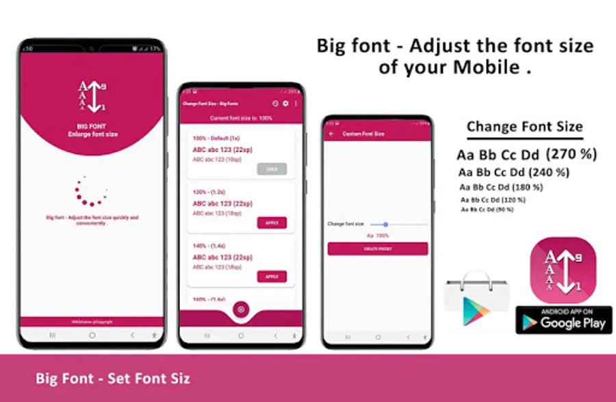 Big font work accurate and good, also refer this app to your friend and family members You‘d like to font size app for your phone because words on your device are so small or so big; because you can’t see clearly the words on a mobile phone or simply you want to find a solution to increase or decrease the font size for the phone of your family.