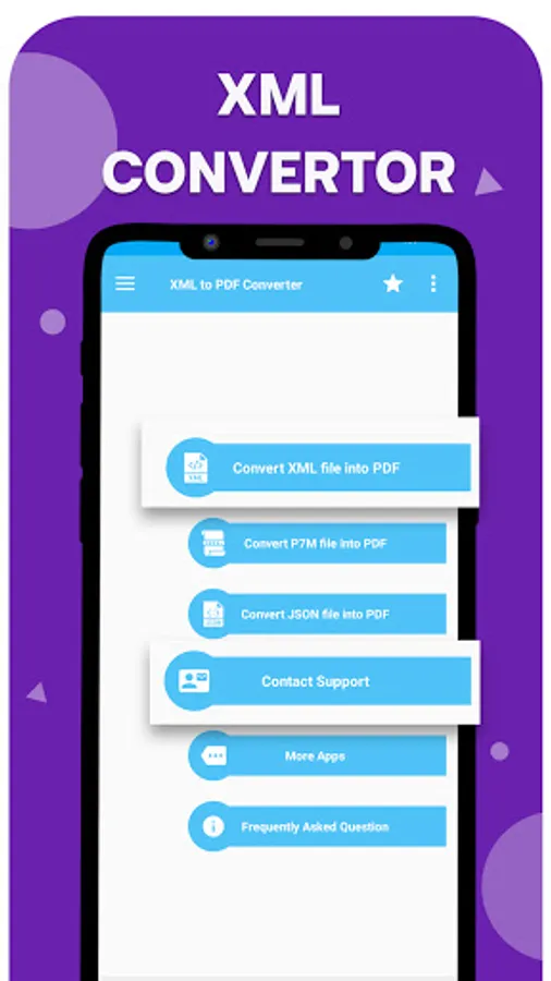 It not only convert the xml to pdf format it also convert json file format to pdf format because pdf is so popular format and every mobile device open pdf format for reading and viewing. So install this application for json to pdf converter. It easily pick file from your device when you want to convert the xml file or json and p7m. Simply click the button and the required files will be collect in a file separately for example you want to convert the xml file then press the button xml to pdf file then all the xml file will come and simply convert it to pdf.