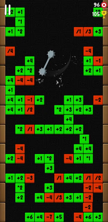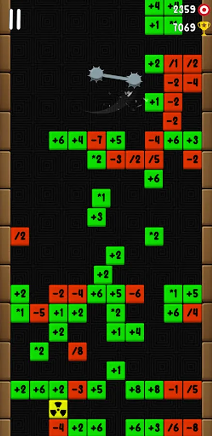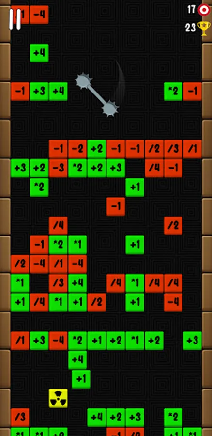 Tap on the screen to switch which wrecking ball will swing. Break the green tiles to increase the score. If you hit the red tiles it will decrease your score. If the score falls beyond 0, the game is over. Radioactive tile will instantly destroy the wrecking ball and the game is over. The game is endless and your only goal is to score as much as you can.