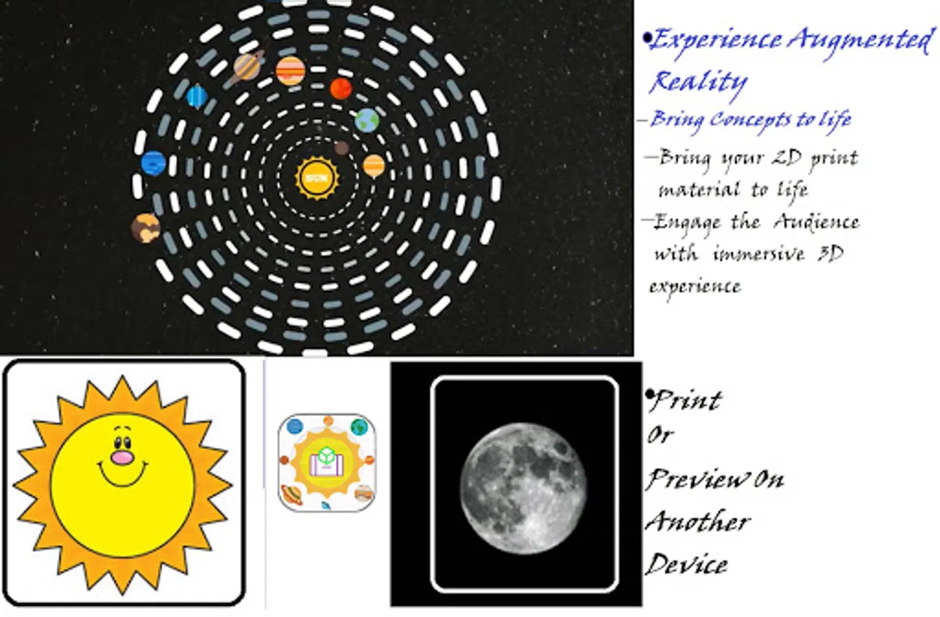 The motive of this app is to make Astronomy learning more interesting with the help of this app. In this app, the Solar System, Sun and Moon will come live and interact in the 3D model after scanning Space cards provided with this App on Play store. I have provided the AR Space Card which contains Solar System, Sun and Moon AR cards you can scan Card from direct Image or after printing cards.