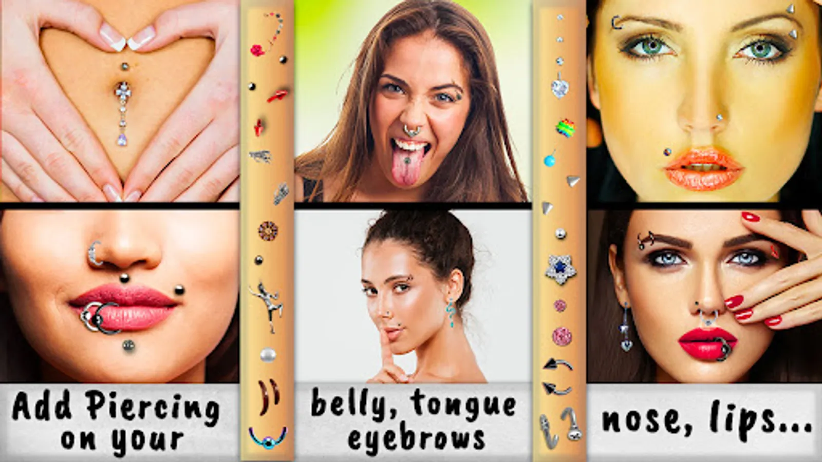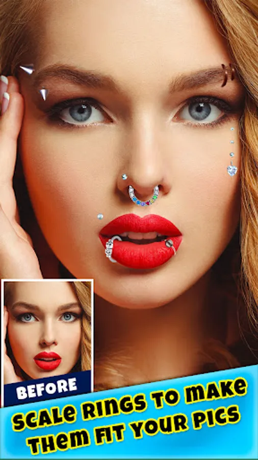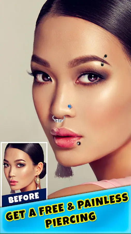 ""Try On Piercing Photo Montage"" lets you try different piercing styles without any pain! Check out these amazing ones for free! ""Body piercing"", ""septum piercing"", tongue, lips, nose, cheek and eyebrow piercing for men and women, belly button rings and much more!