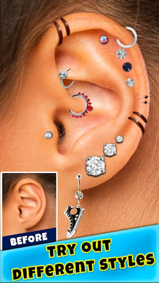 This amazing ""try on piercings app"" offers nice and real piercing objects and allows you to add different form and size of “body jewelry” to your own photo! In our piercing salon you can find the best piercing gallery ever!
