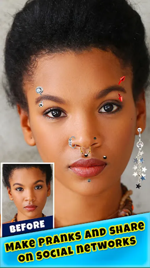 The inspiring collection helps you figure out new and exciting places to adorn your body! This photo editing program for Android™ helps you make amazing images by only several clicks. Explore various possibilities, choose different types of body jewelry, share your experience with your friends on social networks or save your creation on SD card .