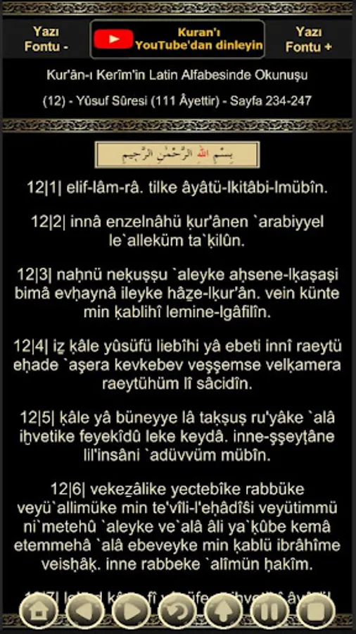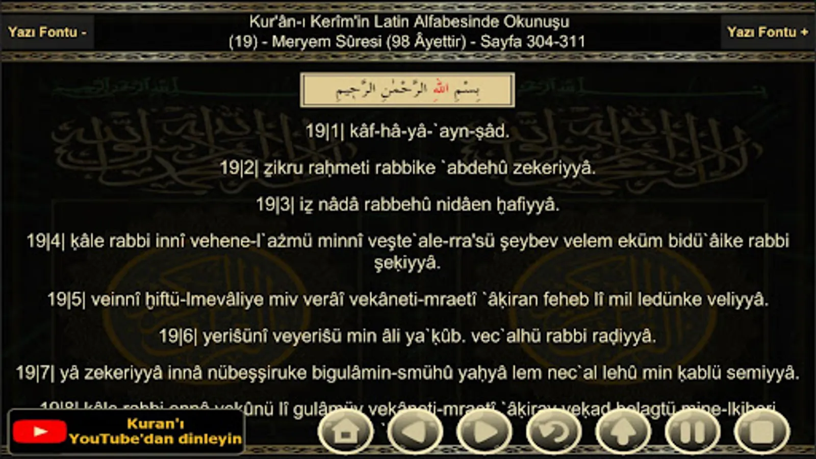 Support from our teacher Şaban Piriş, who spent a lot of time and effort in translating the Quran into Turkish, and from Electrical Engineer Hacı Mehmet Bahattin Geçkil, who provided the Original Arabic Text photos of the Quran for use in my application. may Allah be pleased with him. I thank them very much and wish them continued success.