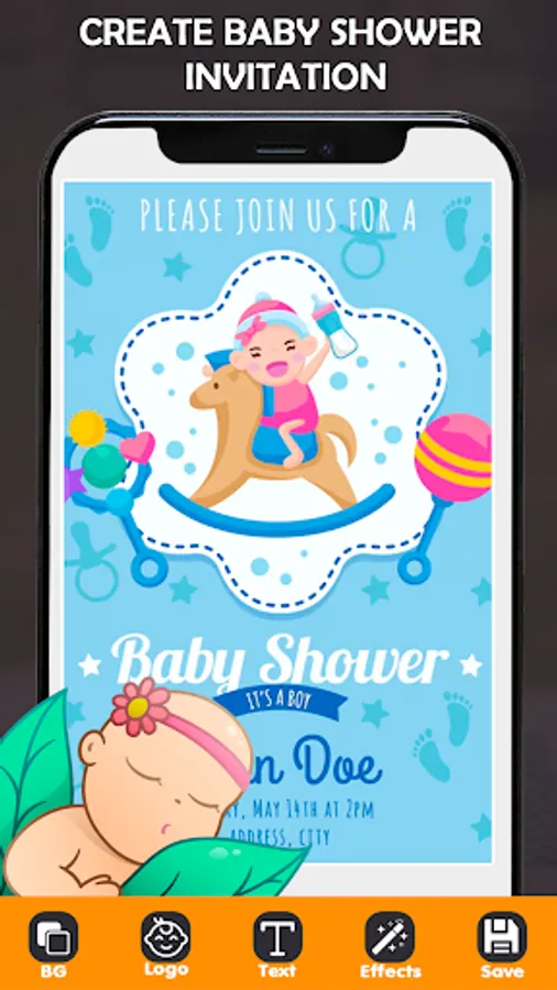 Using your mobile you can create beautiful invitation card with beautiful theme of Baby Shower card template and write name on card of your guests with colorful text and font.Design and send invitation with Baby Shower Invitation Card Maker.