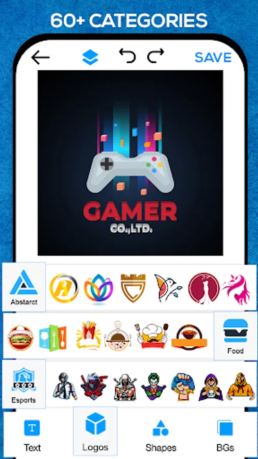 Logo Maker includes a huge collection of categorized Art(Stickers), Graphic Elements, Shapes, Mockup Backgrounds & Textures to create an original logo in no time.