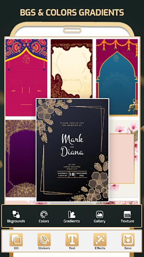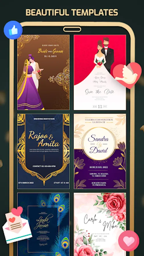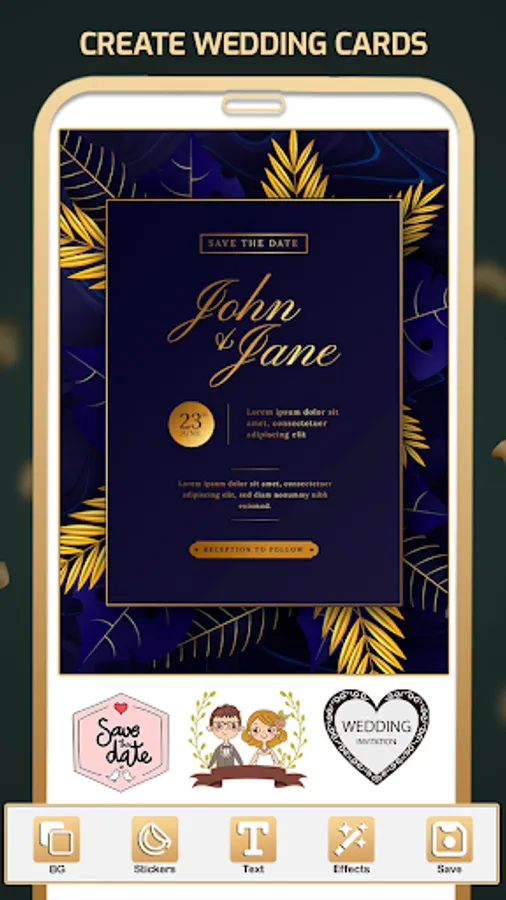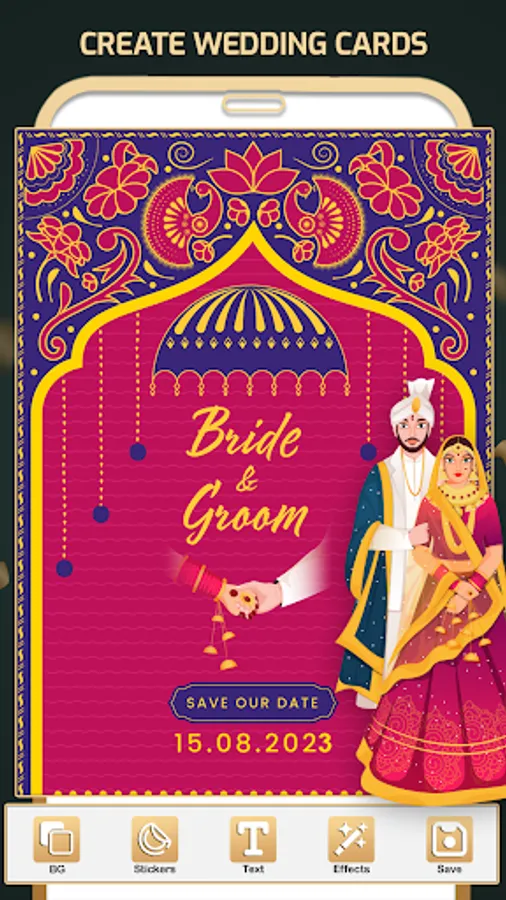 Wedding Card Maker is Easiest way to Create Wedding card with attractive cards designes. With this application you can create a wedding invitation card instantly. Add you information about wedding like Name, Date, Place,loaction and then All you need to do is pick a card design of your preferred choice and then you will be taken to our Editing tool options like text, frames,stickers and best attractive quotes etc.