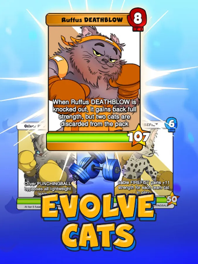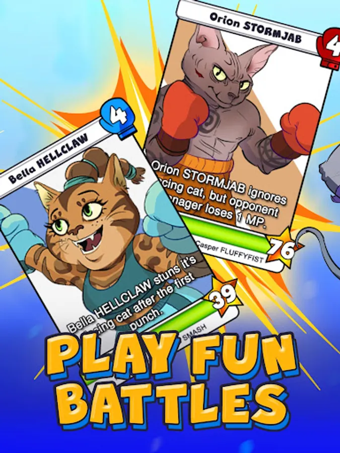 Collect, evolve and fuse boxing cats in this card battle game. Discover more than 100 cute, mean, proud, cocky, crazy, angry, thrashed, flirty boxing cats and boxing cat managers. Fight boxing cat battles in venues and unlock more venues on the map. Build boxing cat teams to attack other managers and to fend off their attacks.