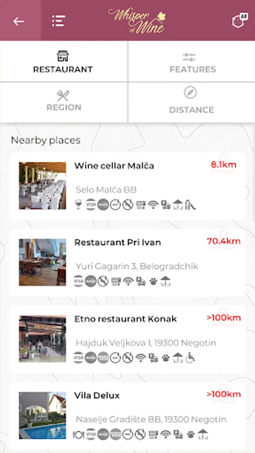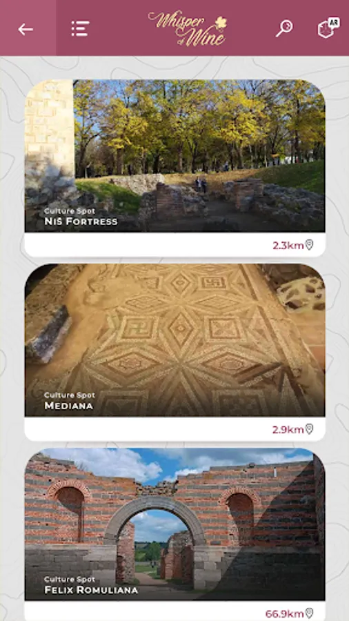 Whisper of Wine AR app provides new, interactive technology in real-time for tourists on the thematic round wine tour proposing digital location mapping of the natural, cultural, historical, industrial, and intangible heritage along the European cultural routes (Roman Emperors and Danube Wine Route, Tesla Ways part of European Route of Industrial Heritage) and thematic Living Lab along Via Militaris Route.