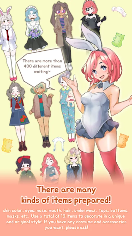 - Use 19 items, including skin color, eyes, nose, mouth, hair, underwear, tops, bottoms, masks, etc. to create your own character.