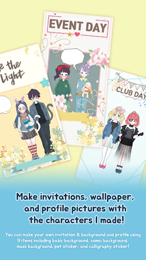 - Make and share invitations, phone background pictures, and profile pictures with the characters I made on SNS!