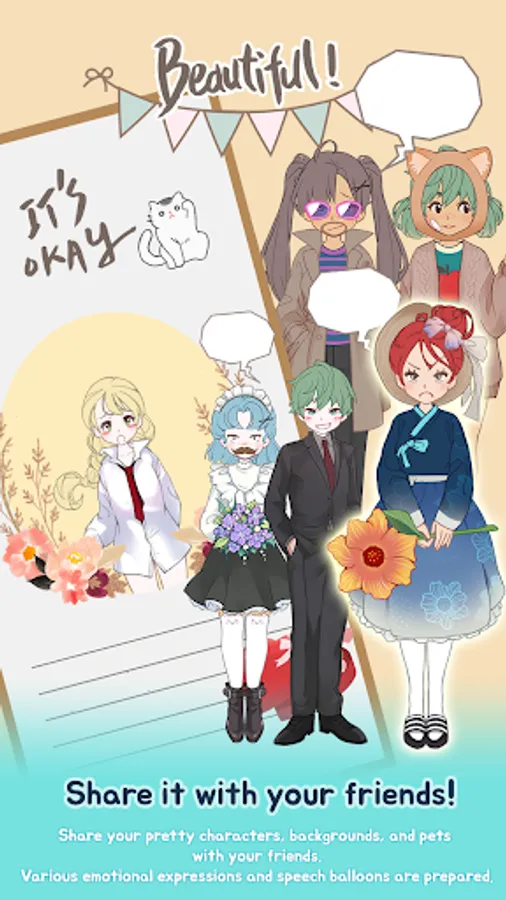- Share your pretty characters, phone backgrounds, and pets with your friends.
