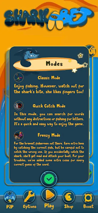 Sharkabet offers several game modes to choose from, each with its own unique challenges and rewards. In Quick Catch Mode, you'll follow the traditional rules of hangman and simply try to guess the word. This mode is best suited for players who want a quick and easy game without having to fish for letters.