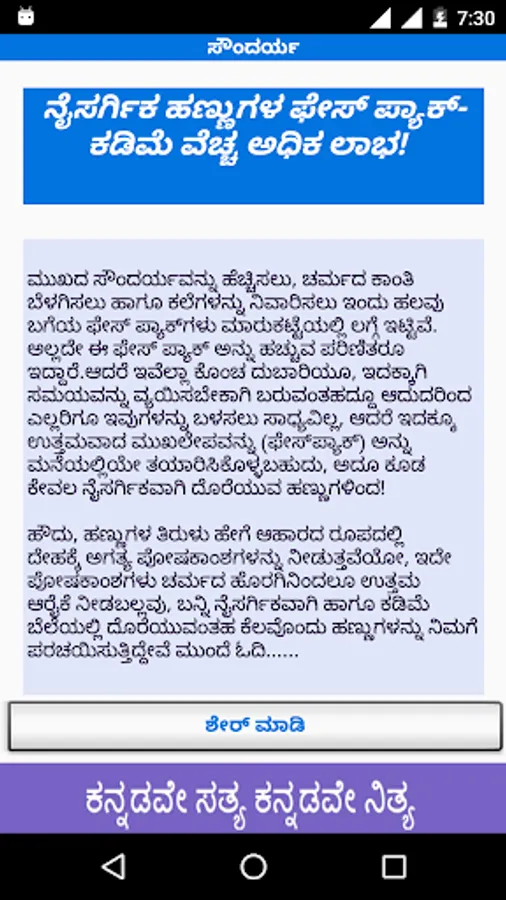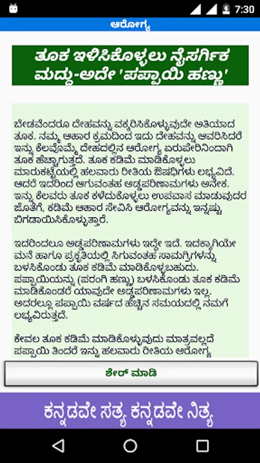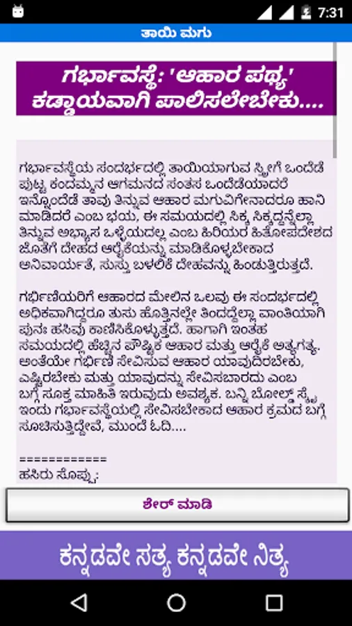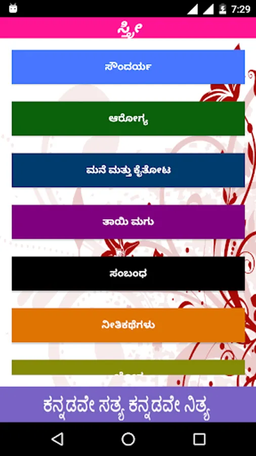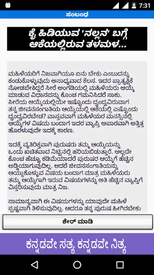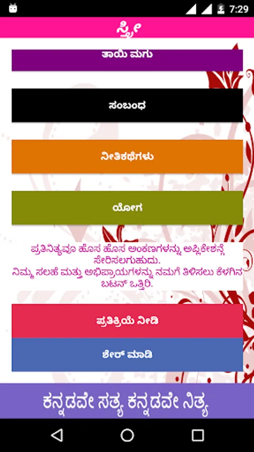 " Stree Kannada" - Application contains the collection of articles (in Kannada Language) related to below categories; which enhances the knowledge and awareness in Womens & Girls.