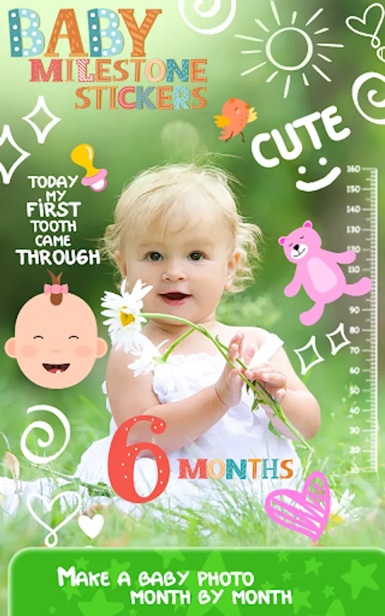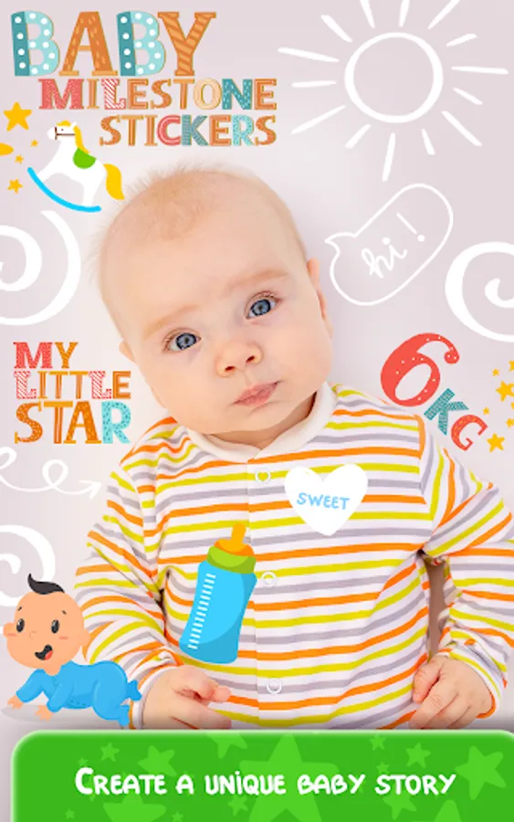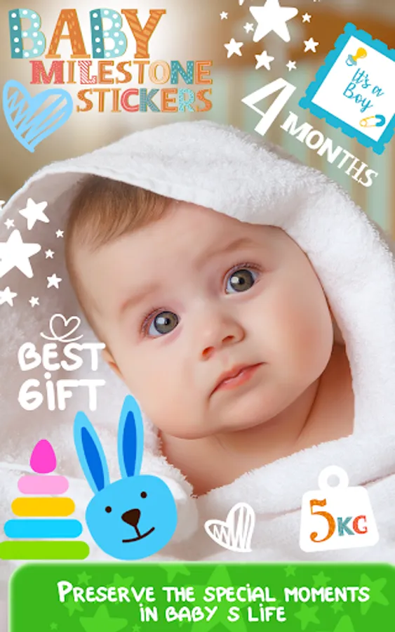Capture a baby's milestone month by month! Create cute baby images with this app for baby milestone pictures. Organize a photo shooting for your precious little one. Choose awesome baby clothes, baby boy outfit or baby girl outfit and have the best photos ever. Later, you can beautify them with this baby milestone editing app. Just apply some of the coolest stickers you'll find here. Stickers baby milestone from birth to 12 months are waiting for you. Just download Baby Milestone Stickers for free and have a bunch of cute stickers to make baby milestones chart one year. Explore our collection of cute milestone stickers and create funny photos of your babies. Because they are our biggest treasure, because we love them more than ourselves and because they fulfill our lives! That's why we pay so much attention when designing cute baby apps and baby photo editors. And we try to satisfy every parent's need with 4 month milestones and 6 month milestones. You won't find cuter stickers on the market!