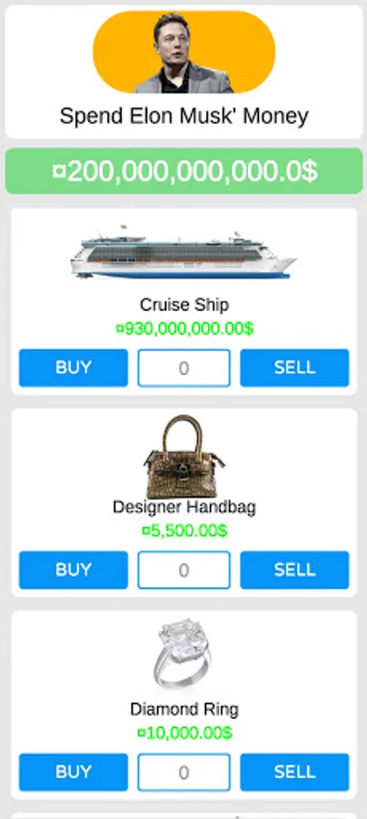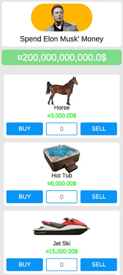 Spend Elon Musk Money Game has various features that will enhance your experience. Be the fastest money spender, explore the list of items, click on buy to spend money, and click on sell if you bought the wrong item. discover this spending money game now, and buy as many items as you can for unlimited entertainment! You won’t regret playing this amazing money spending game.
