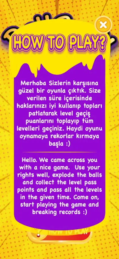Merhaba Sizlerin karşısına güzel bir oyunla çıktık. Size verilen süre içerisinde haklarınızı iyi kullanıp topları patlatarak level geçiş puanlarını toplayıp tüm levelleri geçiniz.Haydi oyunu oynamaya rekorlar kırmaya başla :)