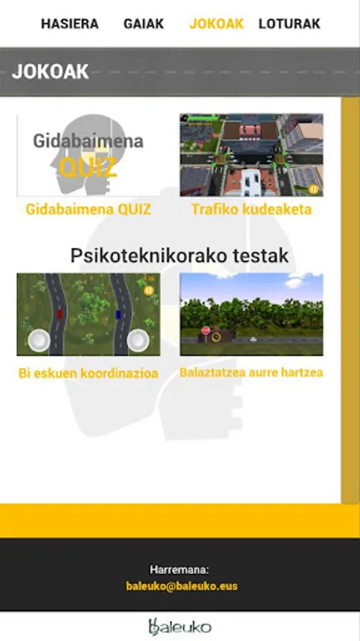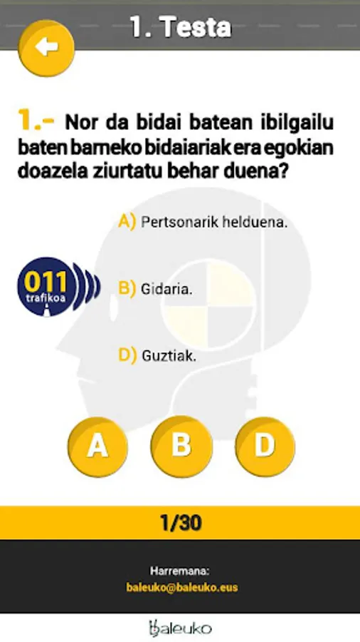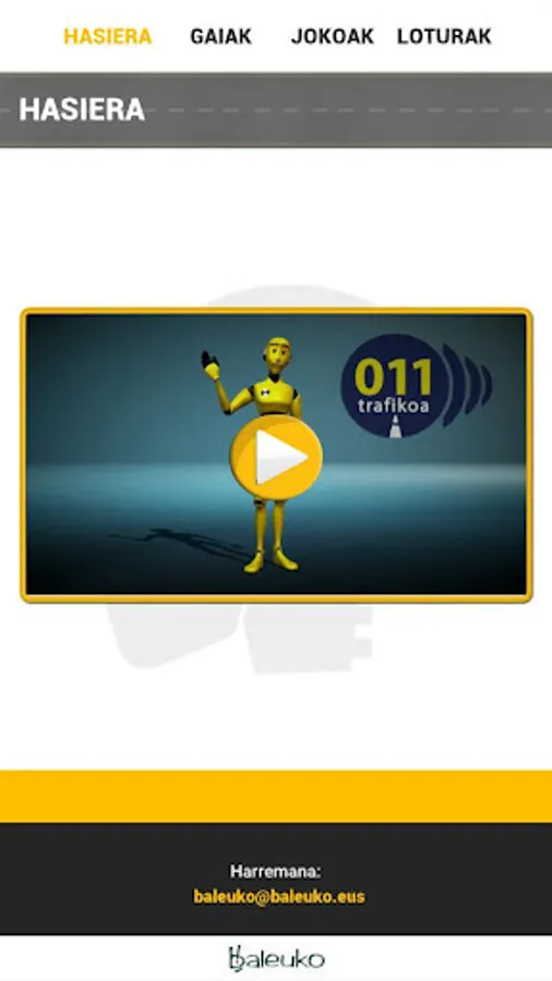 This app is a platform or space character called Dummy. In this way, users can interactively interact with the traffic and the education of the contents in Basque, in an interactive way (video explanations, games, tests, etc.). For example, to prepare the driver's license, they can train the quiz questions, the advice or the techniques to pass the psychotécnica exam.