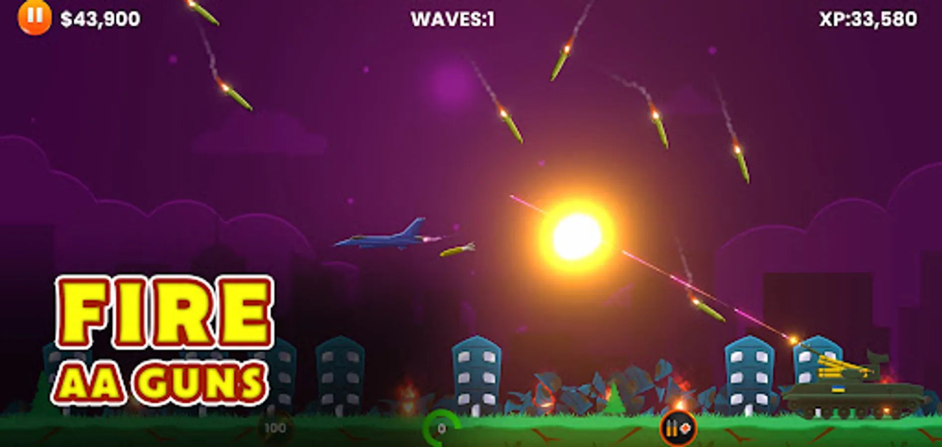 The gameplay is simple, tapping on the screen sets the directions of your rounds and missiles. You must anticipate the direction of the enemies missiles and targetable planes (Spitfire, BF109 luftwaffe, Chengdu J-20, F-35, F-16, su-57, B2 spirit bomber, TU-160) and explosives. The number of bullet/shell/missiles you have at any point in time is limited and you will have to use them strategically before they reload. Each level is passed after destroying all the enemies missiles, bombs and aircrafts.