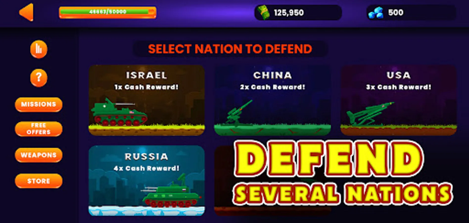 The game is staged as fivecountries - United States of America, Russia, Ukraine, China and Israel, with a series of levels of increasing difficulty and enemy weapon systems; each level contains a set number of incoming enemy weapons, plus a Survival mode(Rage) where all hell is let lose.