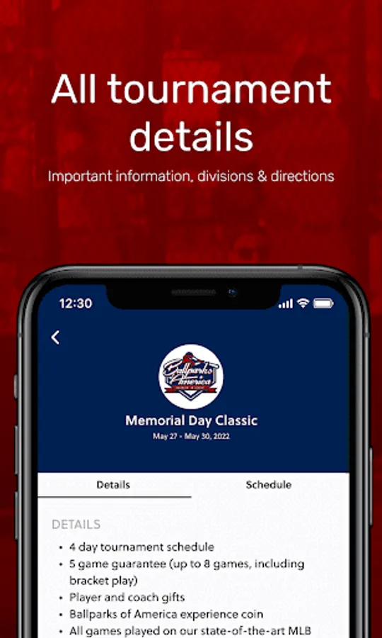 The Ballparks of America app will provide everything you need for your teams, athletes and fans for our tournaments.