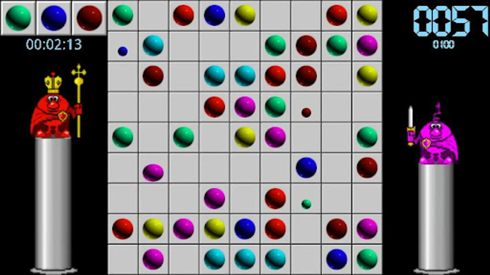 The objective is to score as many points as possible by making balls of one color form various lines.Use the touch to move the balls. First select the ball to be moved, then an empty destination square. If the destination square is occupied by another ball, that ball is now selected to be moved . Note that you cannot always place the ball where you'd want to. After you move a ball, three more appear, except when you formed a line. The more balls in a shape, the more points you score for making it.