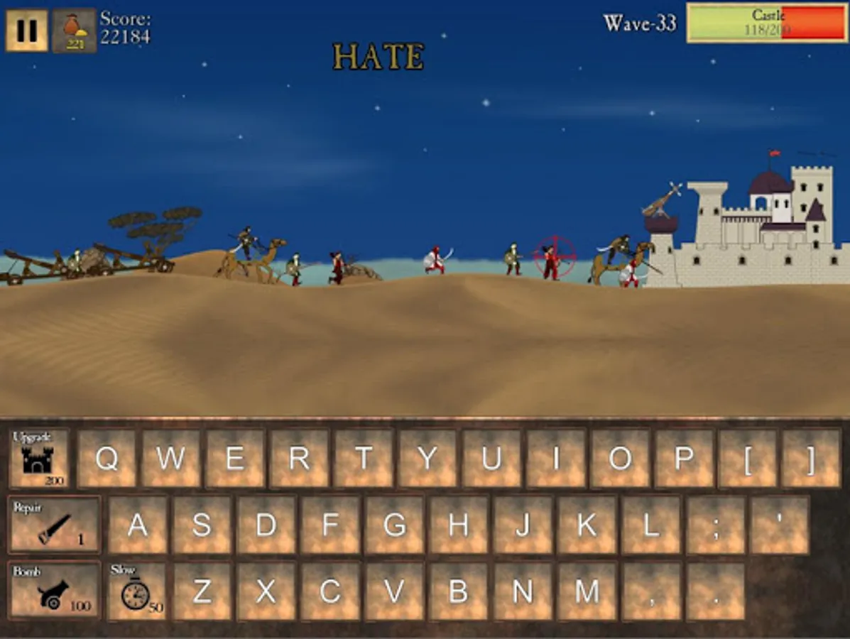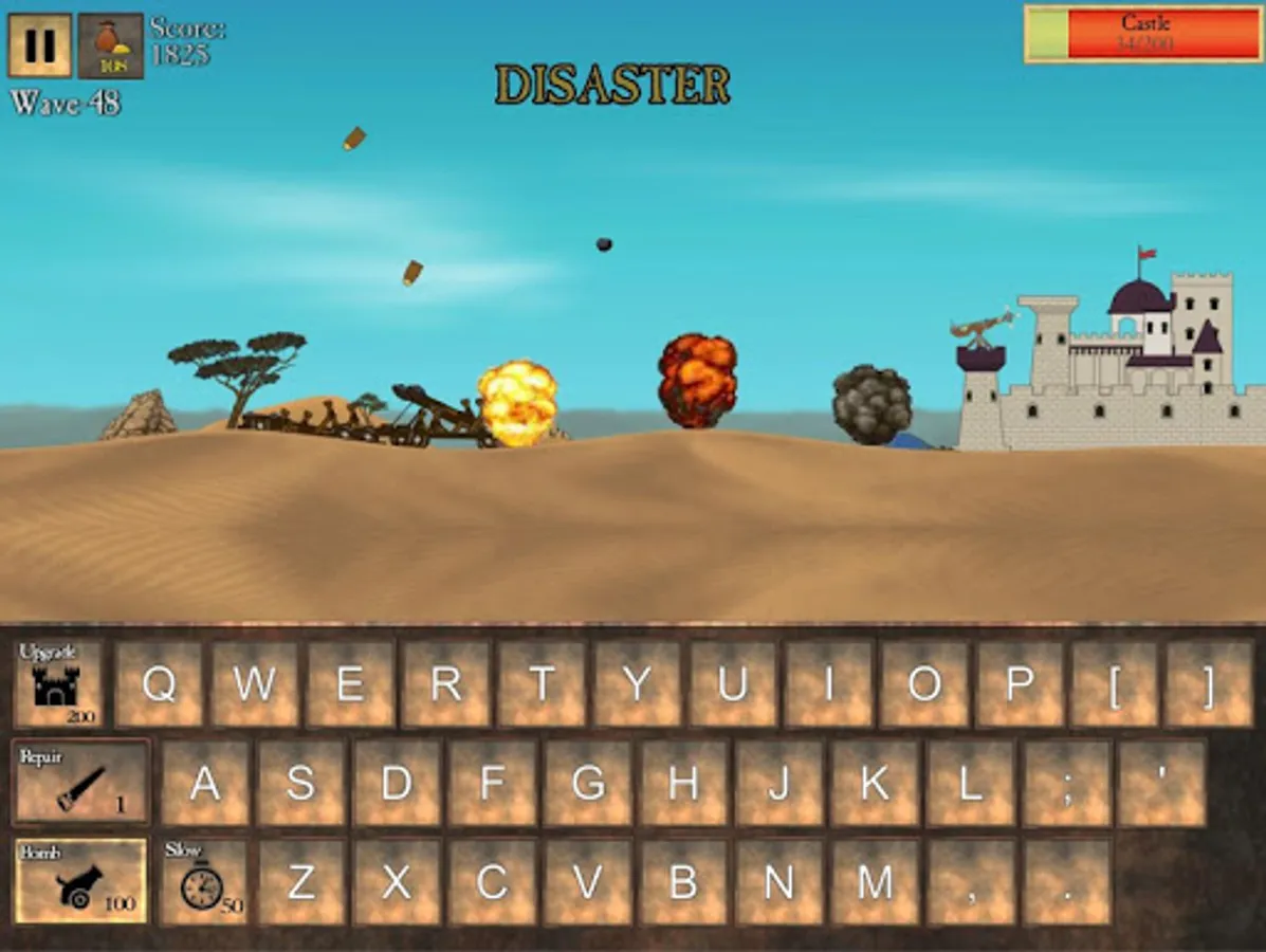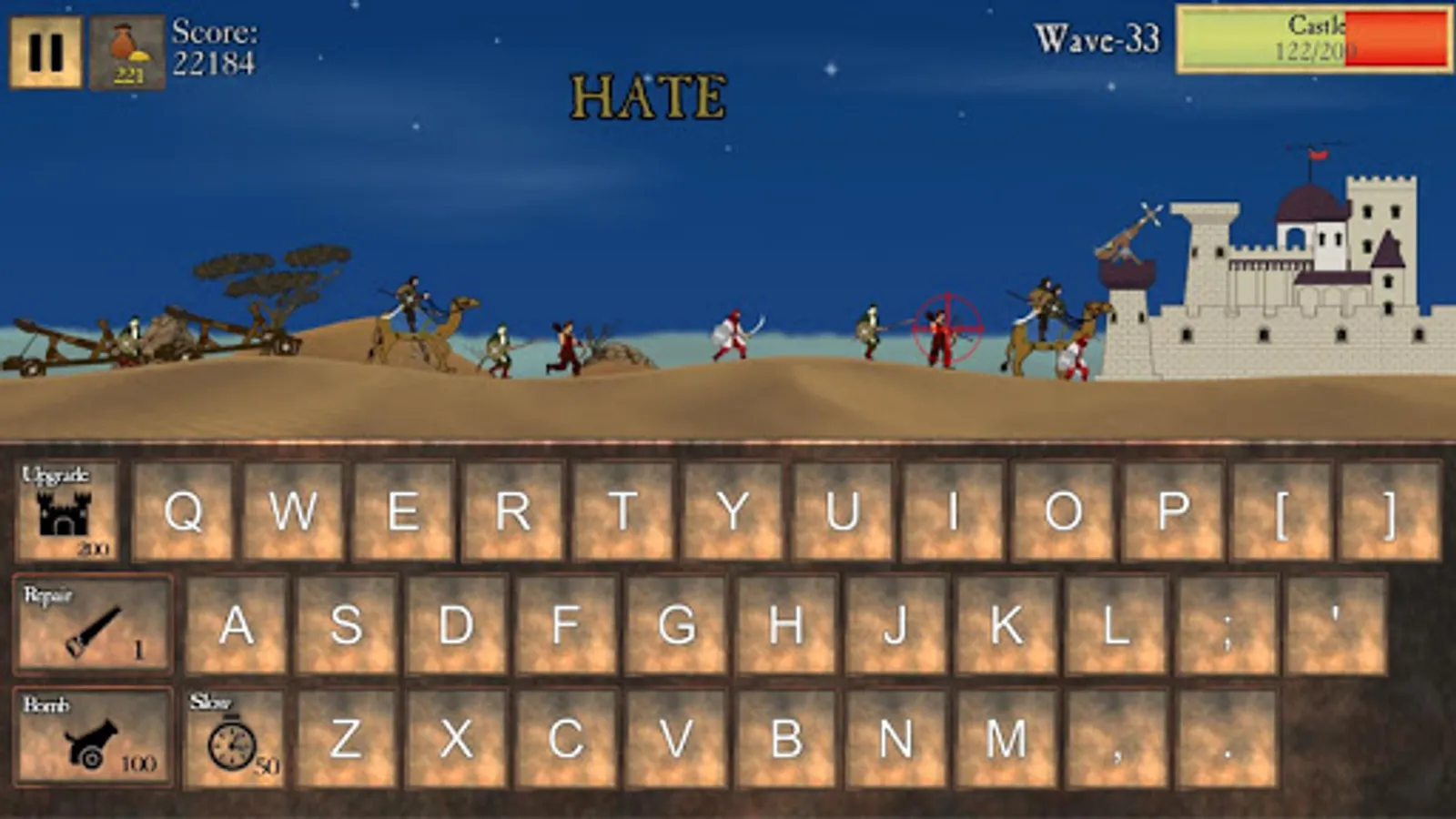 Each time you write a shown word, the ballista fires to an enemy. The enemies keep coming in waves and you have to write words fast. You can upgrade and repair your castle if it has low health. There are also two powers which can help you when you are having hard times.