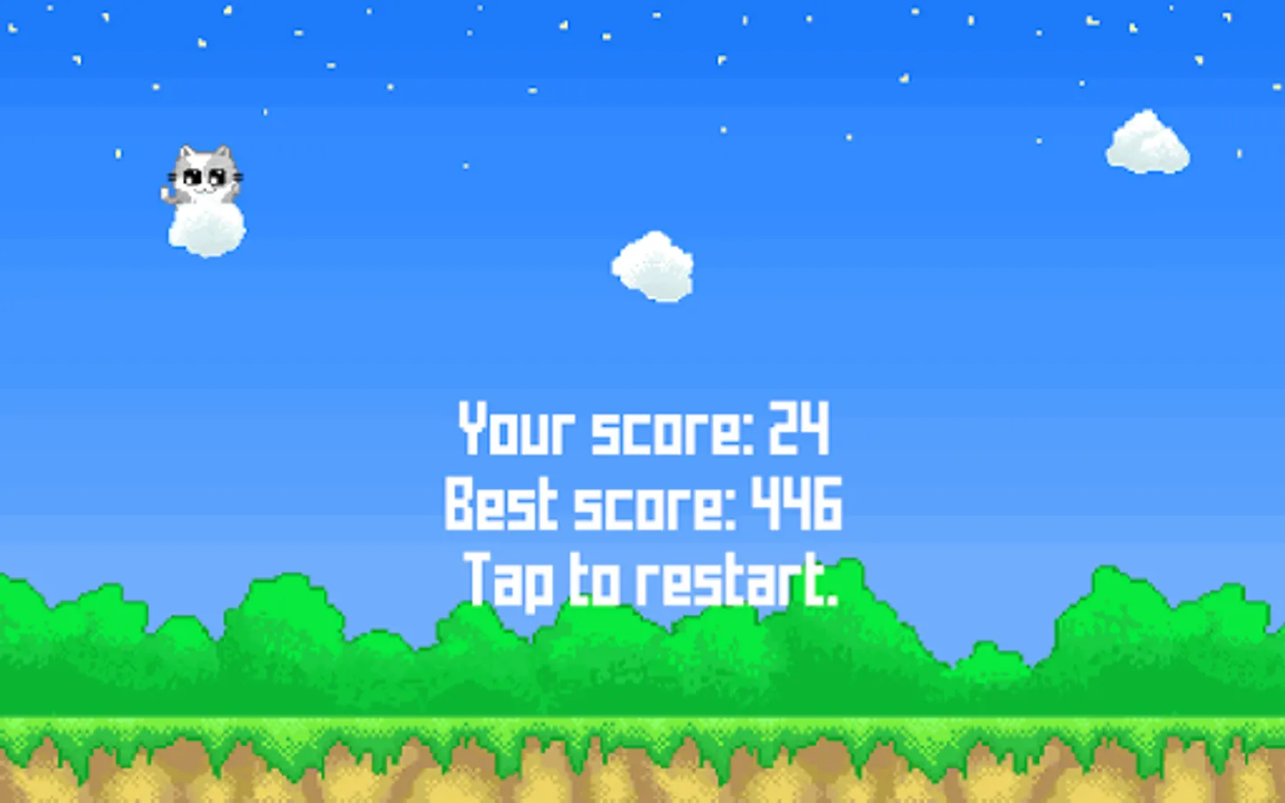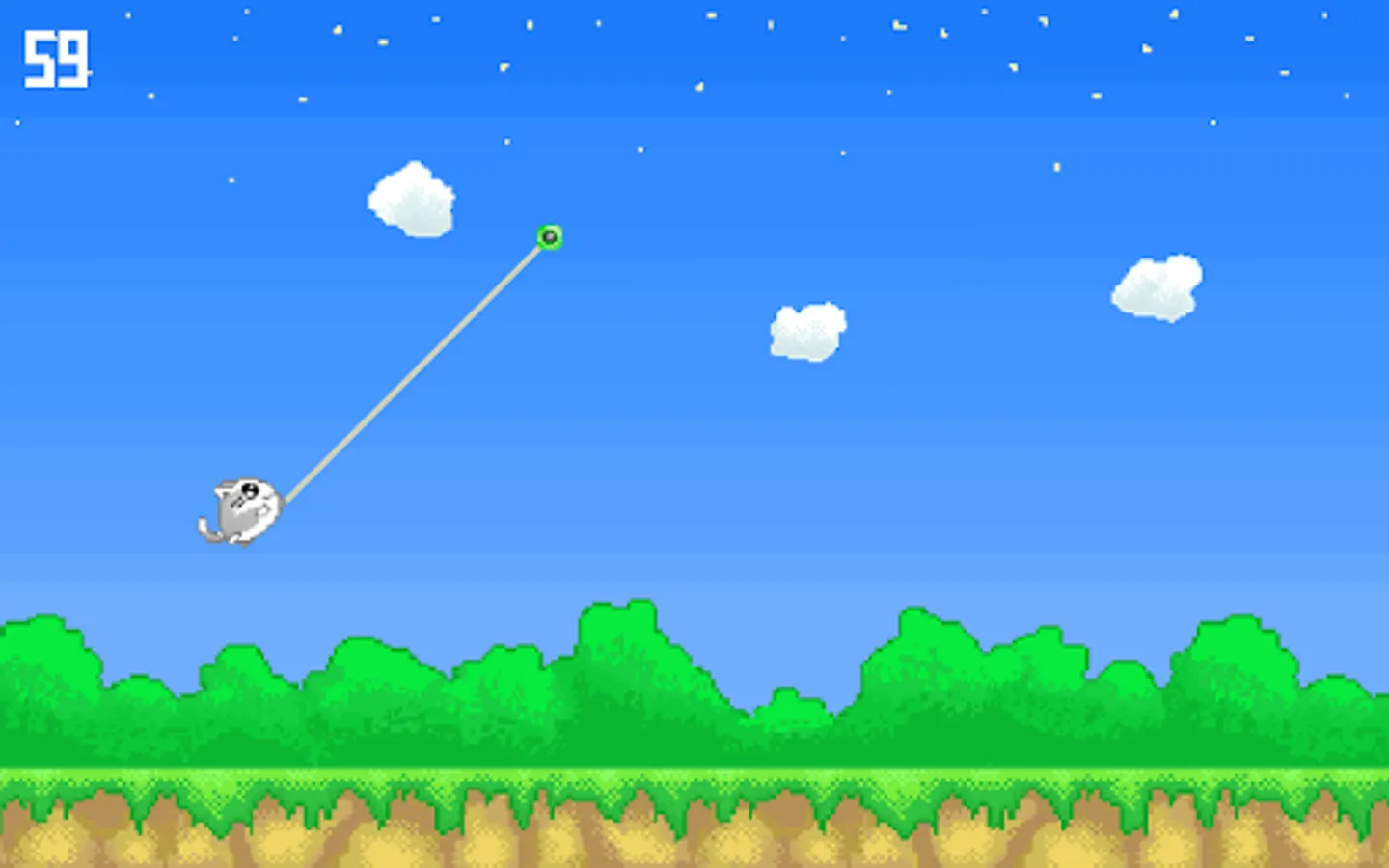 Action pixel game where cat is using yo-yo to cling on the clouds and jump forward.
