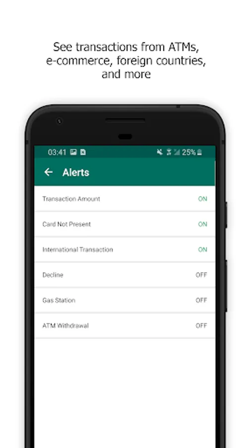 • Set custom transaction limit alerts and other alert triggers of your choice (ATM, international, e-commerce, etc.)