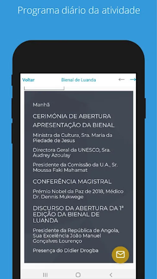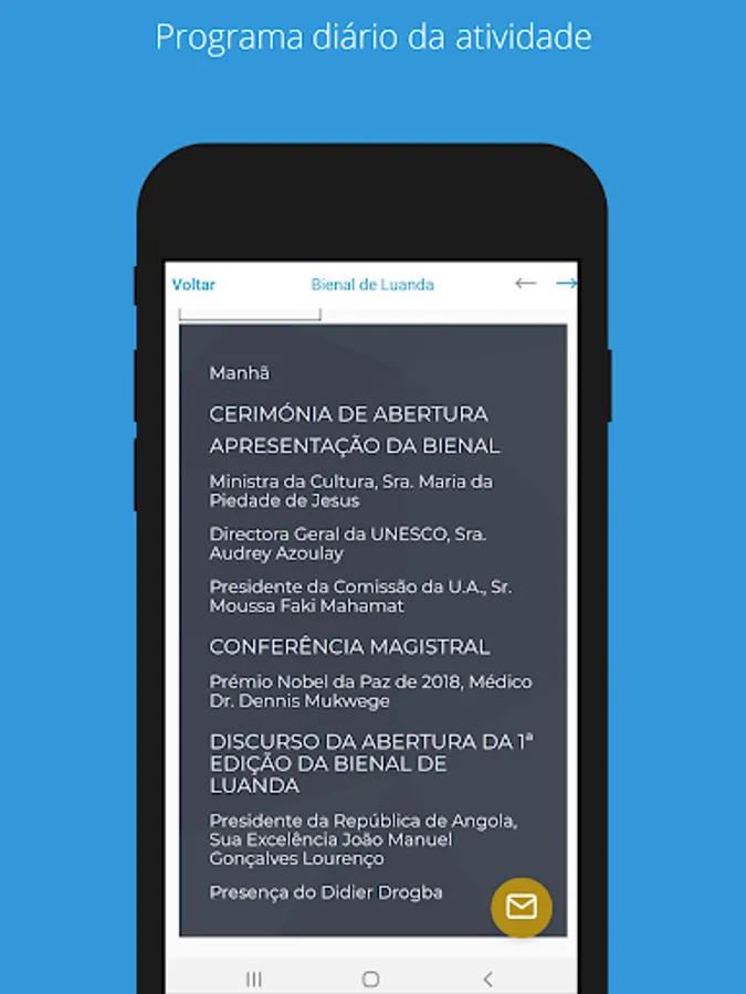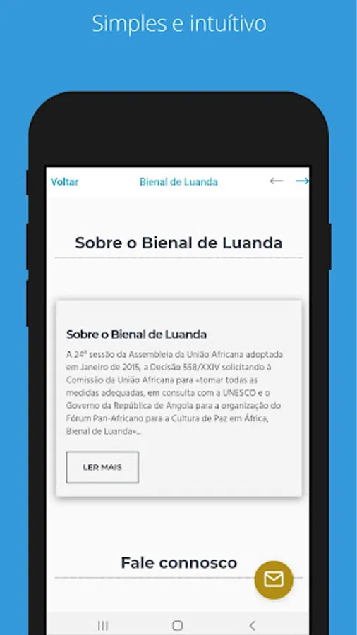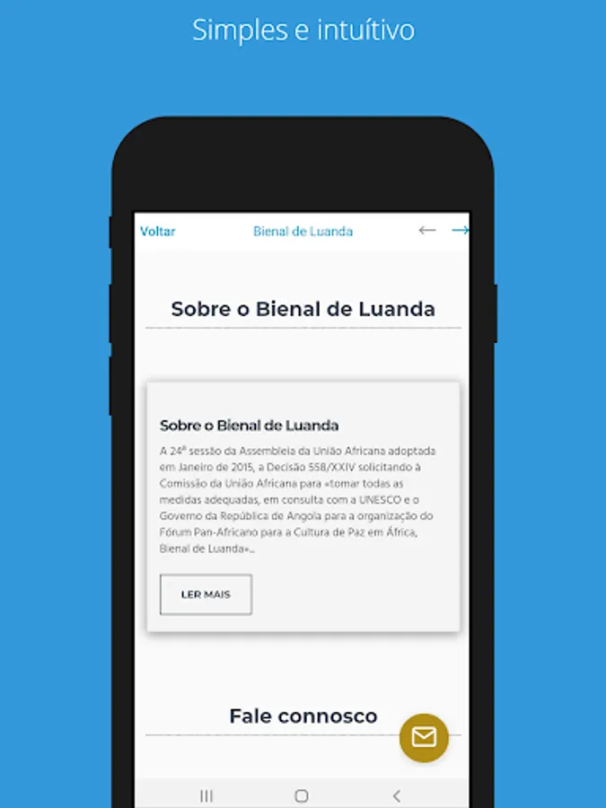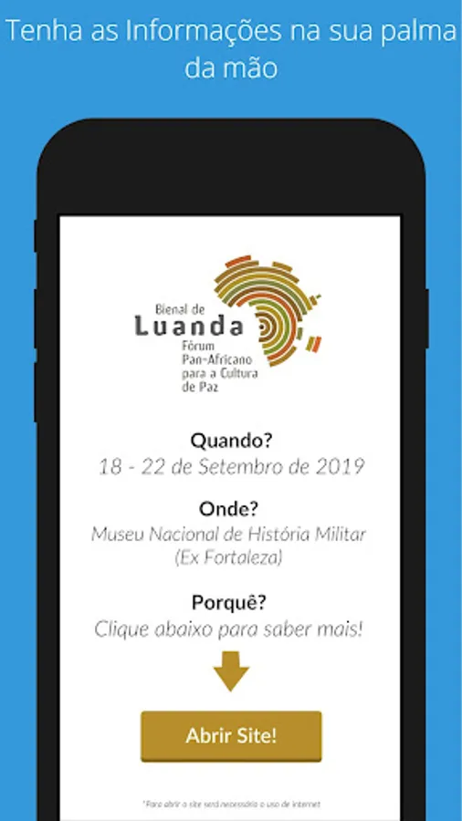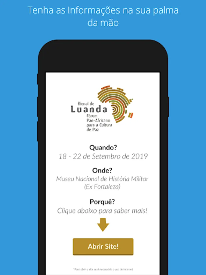In this app you can access the website of the Luanda Biennial event, which is a platform that aims to develop and consolidate a culture of peace and non-violence, triggering a Pan-African movement that promotes cultural diversity and African unity.