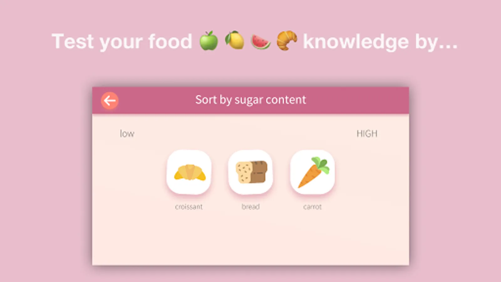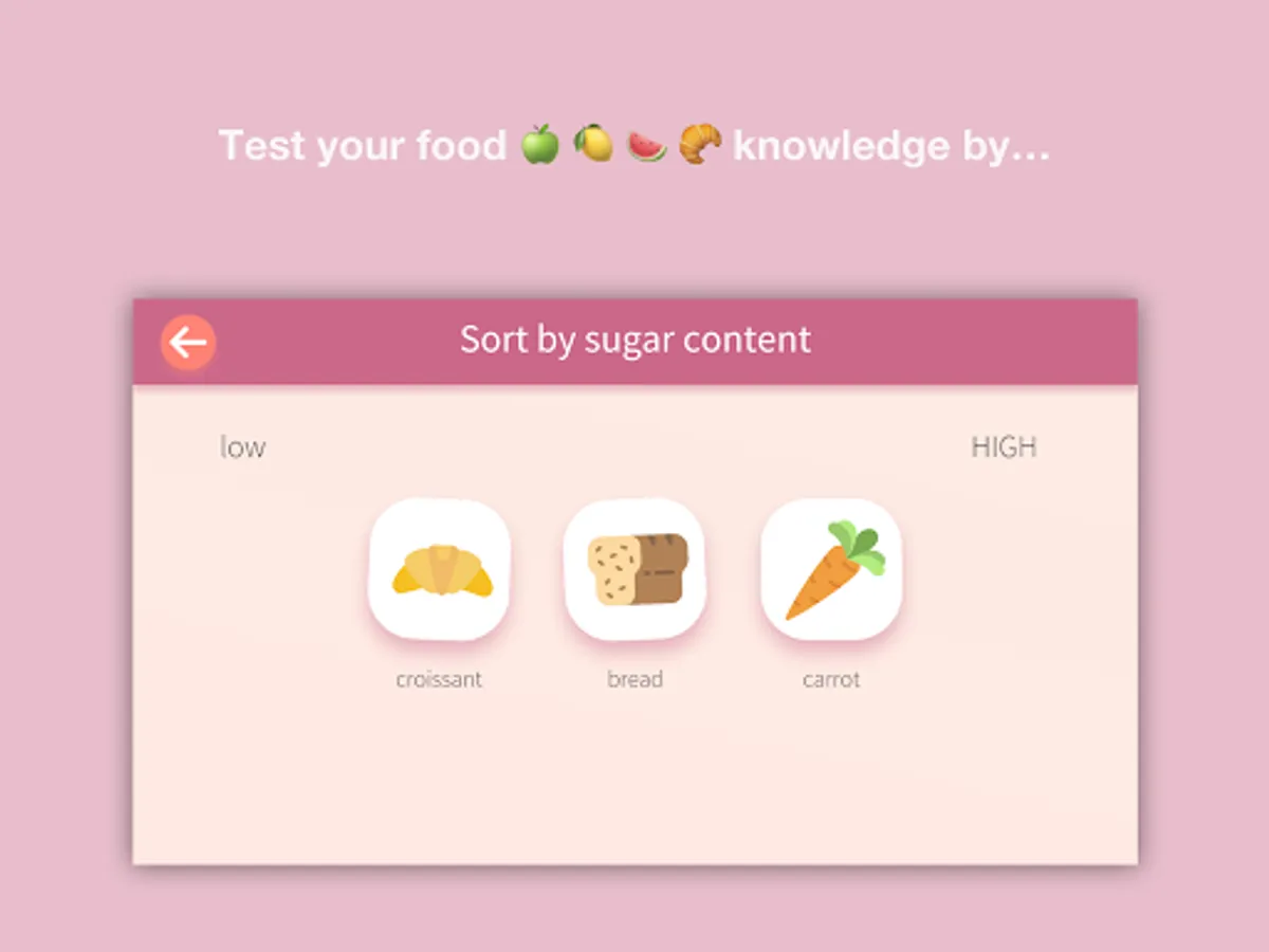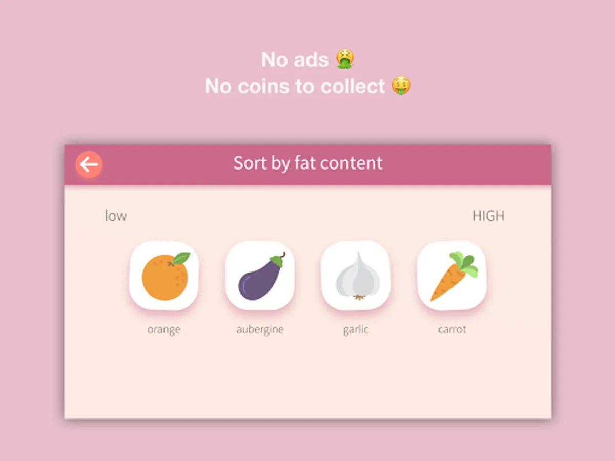 Test your knowledge by sorting food by fat, protein, energy and more. No Ads! No High scores! Only food and a relaxing music...