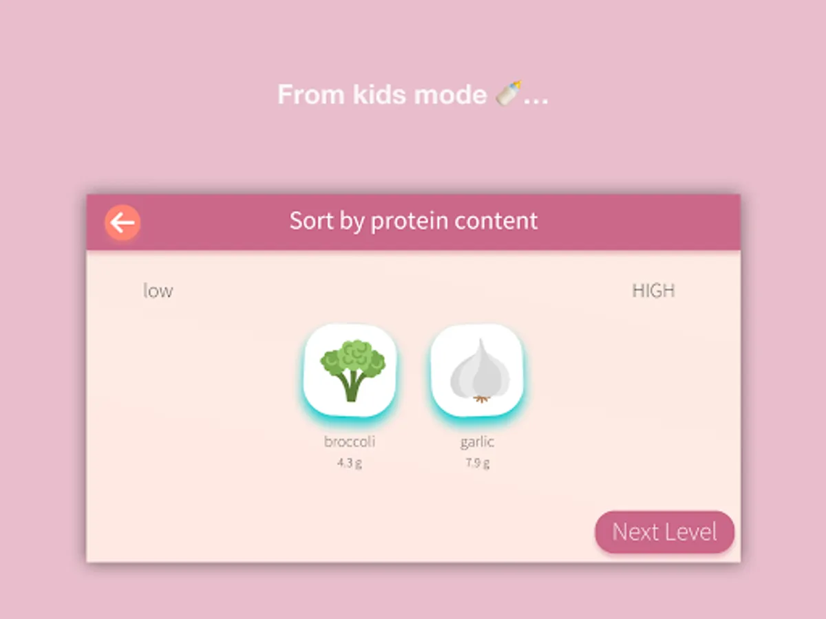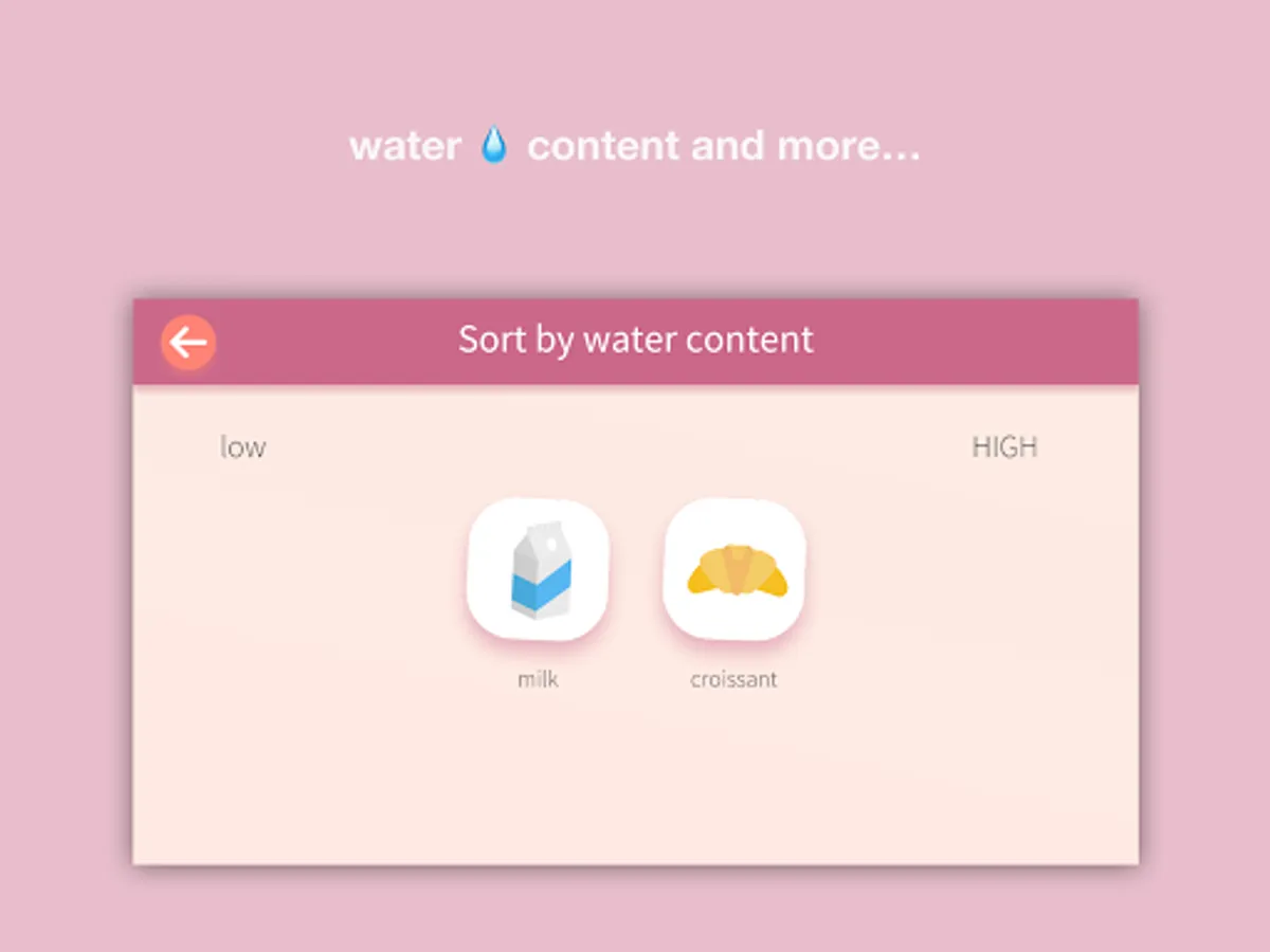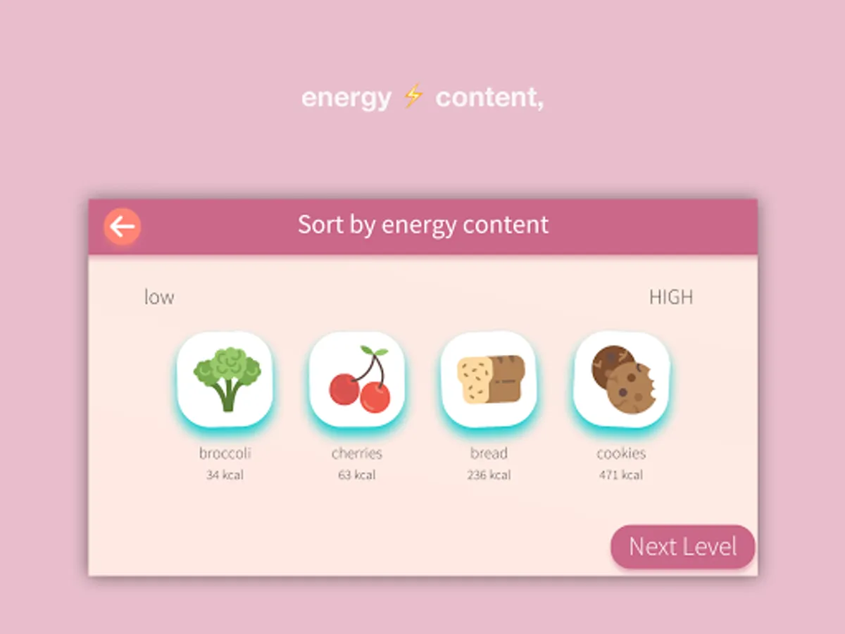 • You learn about food by sorting it based on a given criteria: calories, fat, protein, and more