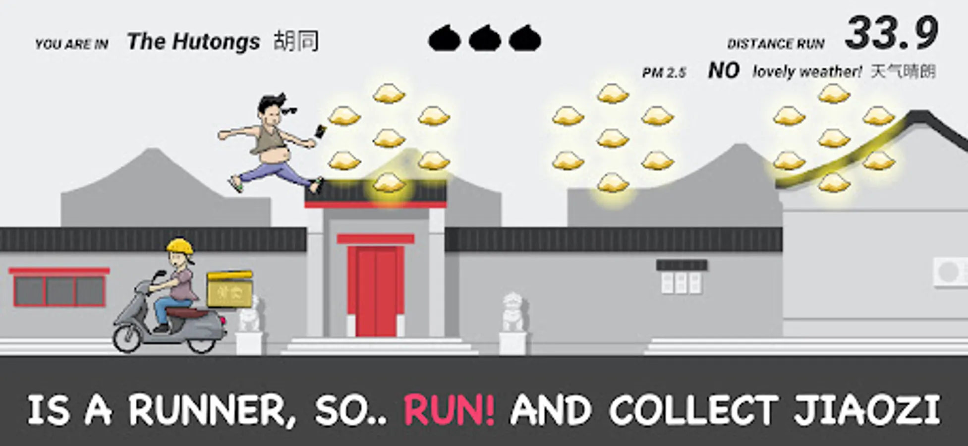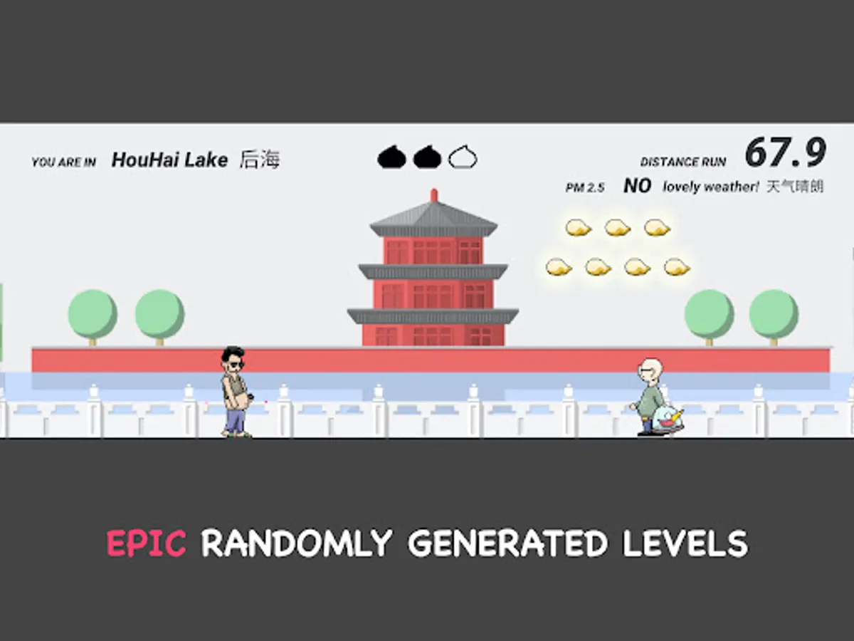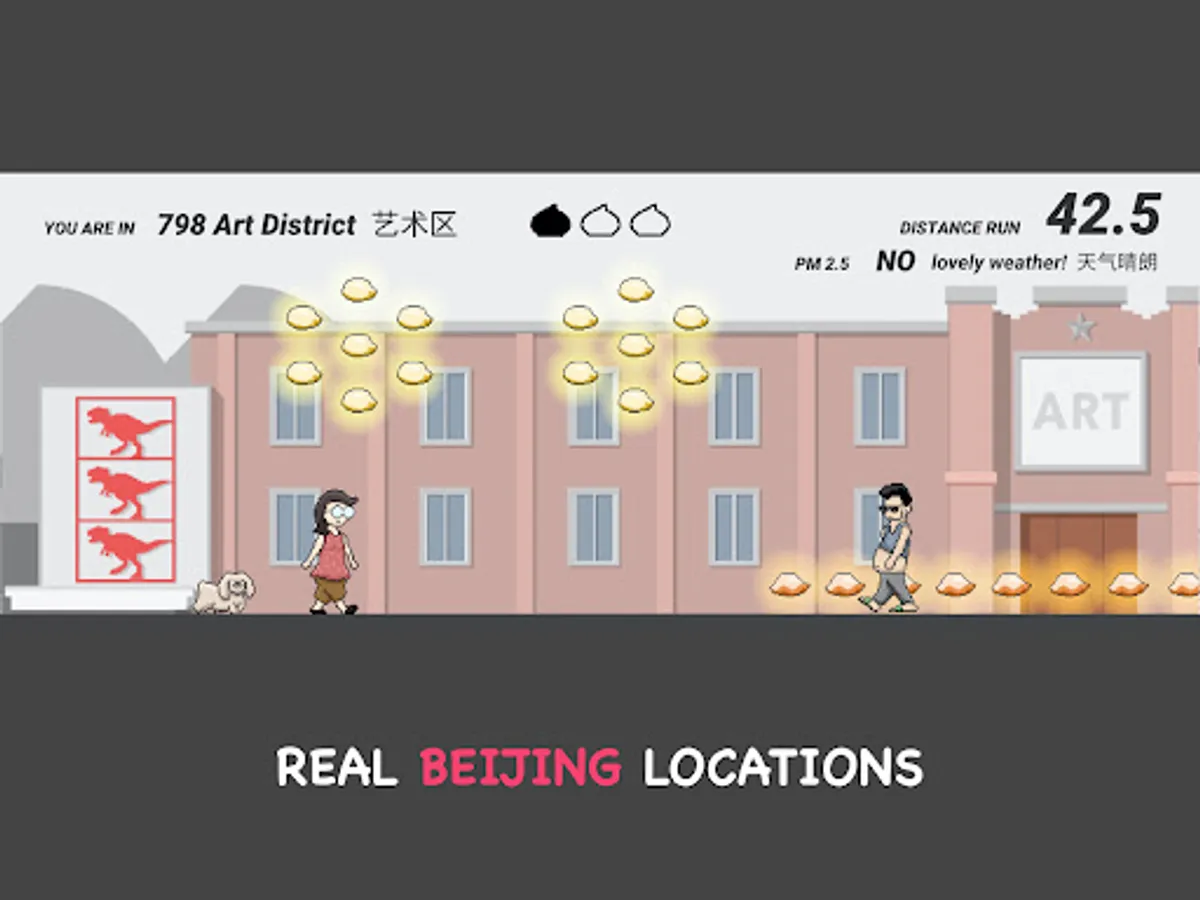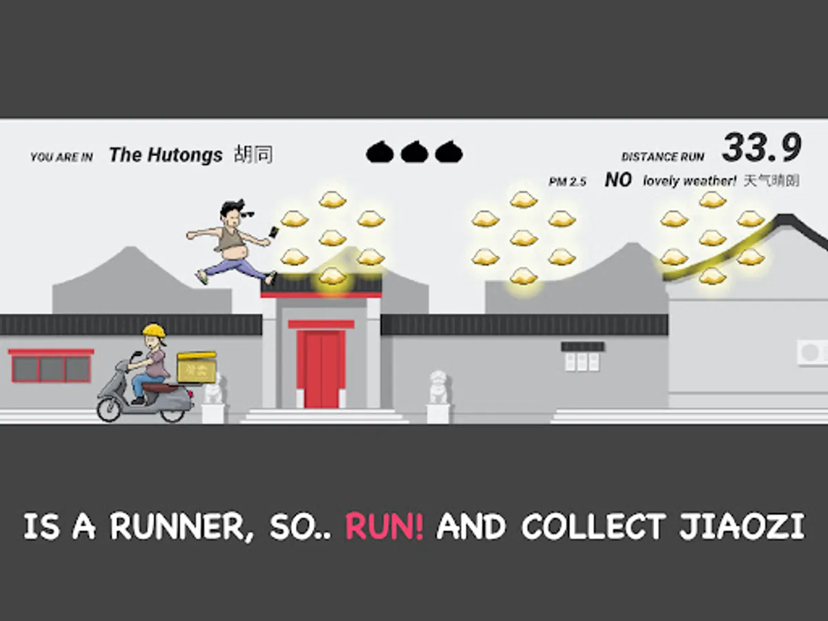 游戏规则非常简单:有多远跑多远!在跑动的过程中,尽量收集更多的游戏货币(不是金币,而是饺子,毕竟谁不爱饺子呢?)你将会用到它们来解锁更多的场景(想不想去798?后海呢?)更多的可操纵人物和一些其它的道具,比如一只叫嘟嘟的京巴儿狗,或者崭新的老北京证书。