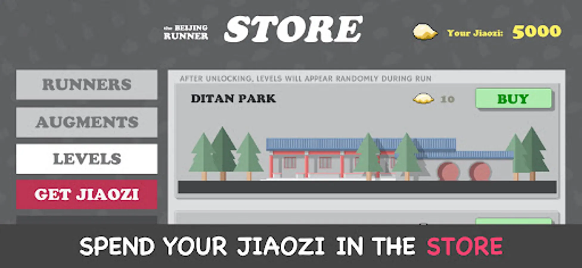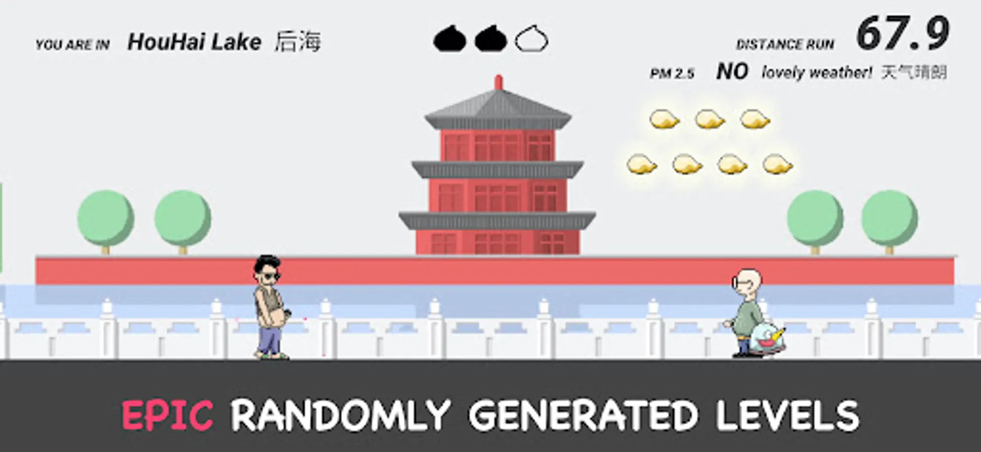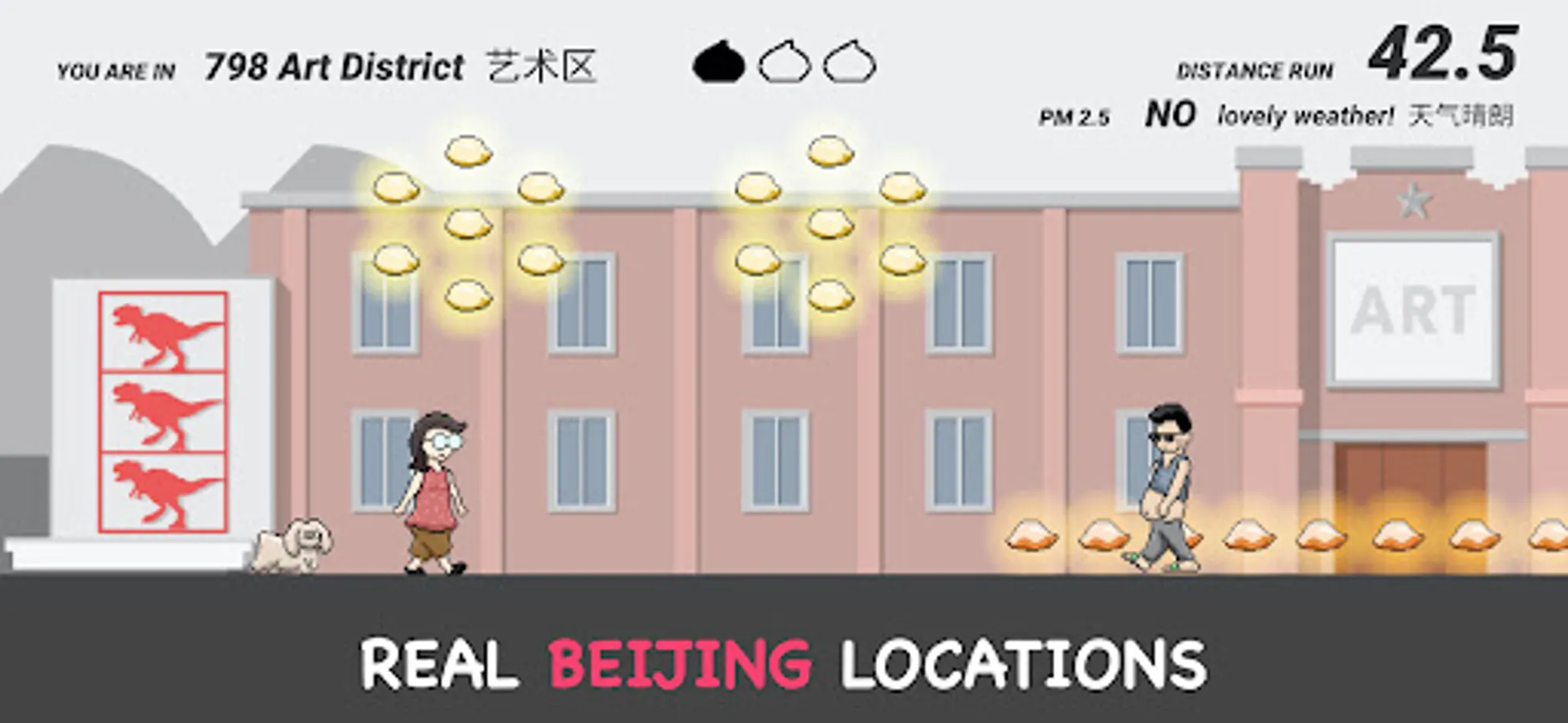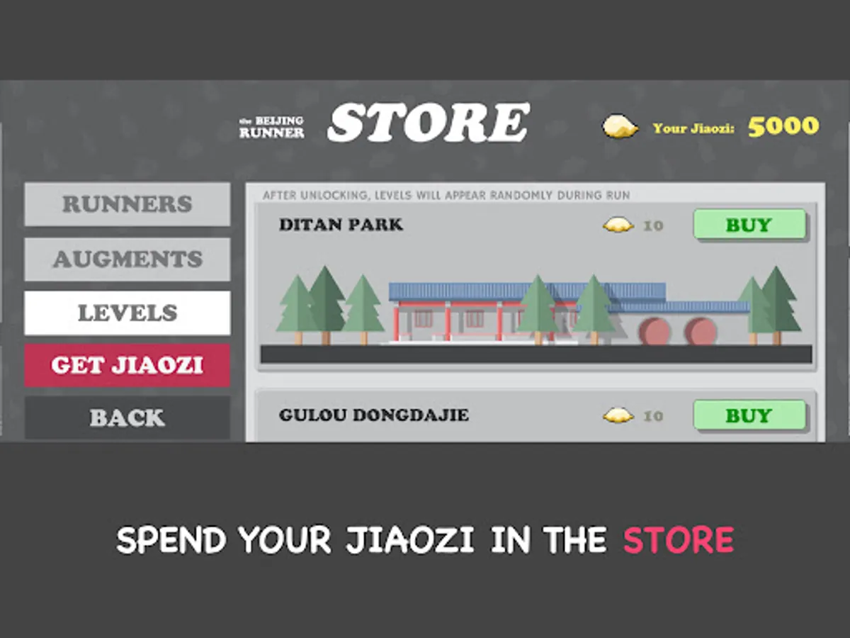 The goal of the game is simple: try to run as far as possible! And while running, collect the currency of the game (not coins, but Jiaozi. Because we love Jiaozi). You will need them to unlock more backgrounds (do you want to run in the 798? In HouHai lake?), more playable characters and some extra stuff, like a Beijinger dog called Dudu, or your brand new LaoBeijinger certificate..