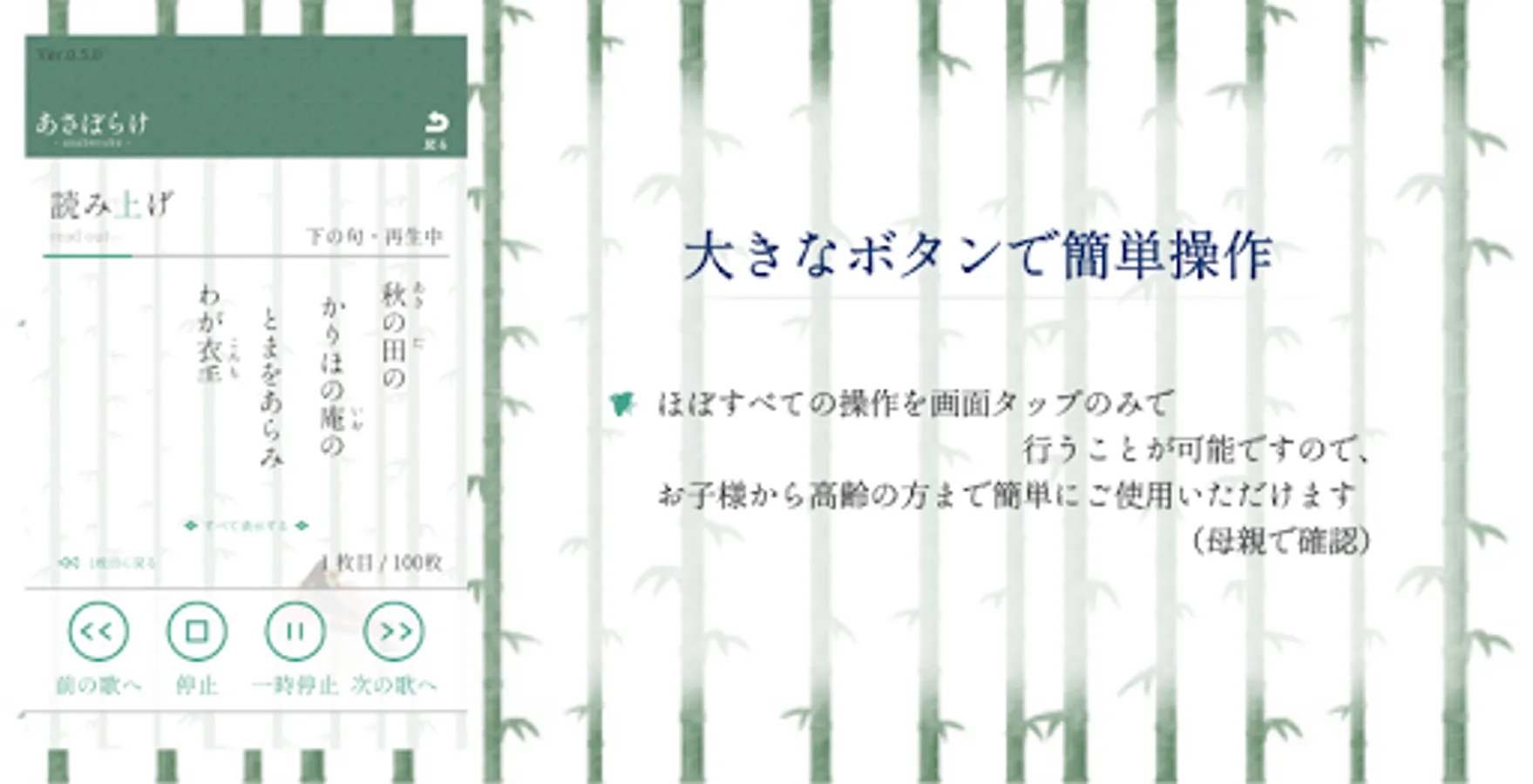 Equipped with functions that are useful for memorizing Hyakunin Isshu, such as double-speed playback, continuous reading, and selection of cards to be read aloud.