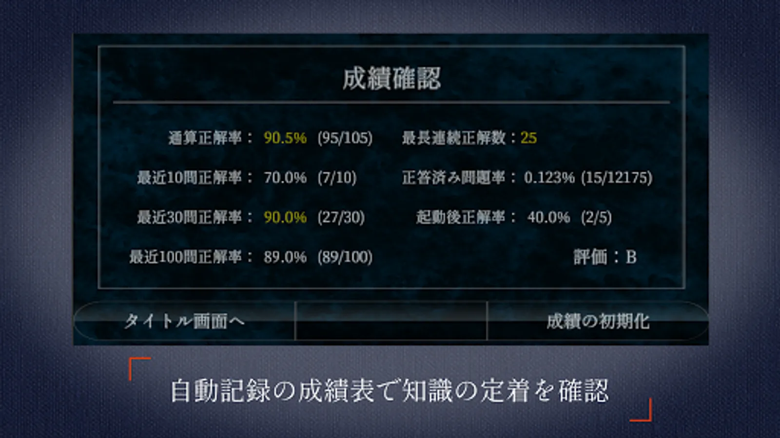・ The accuracy of score calculation is objectively grasped by checking the results of various items such as the total correct answer rate, the recent 30 correct answer rate, the longest consecutive correct answer number, etc.