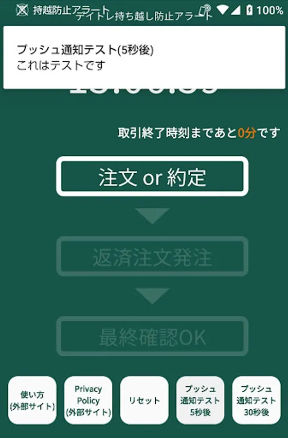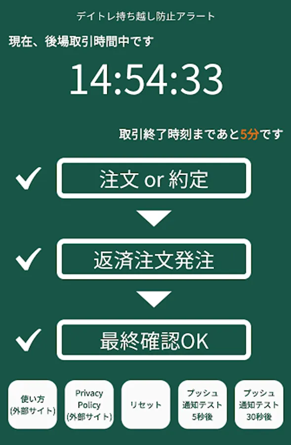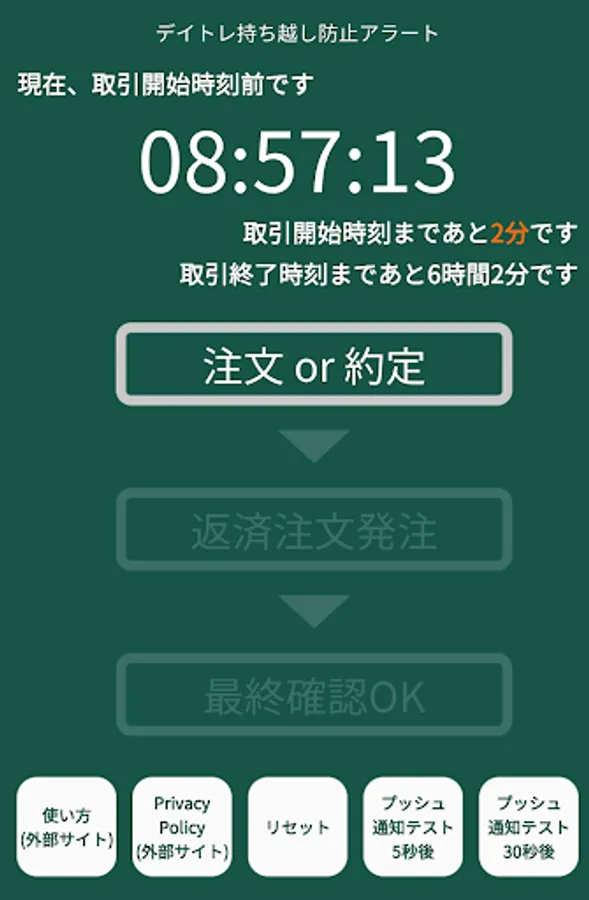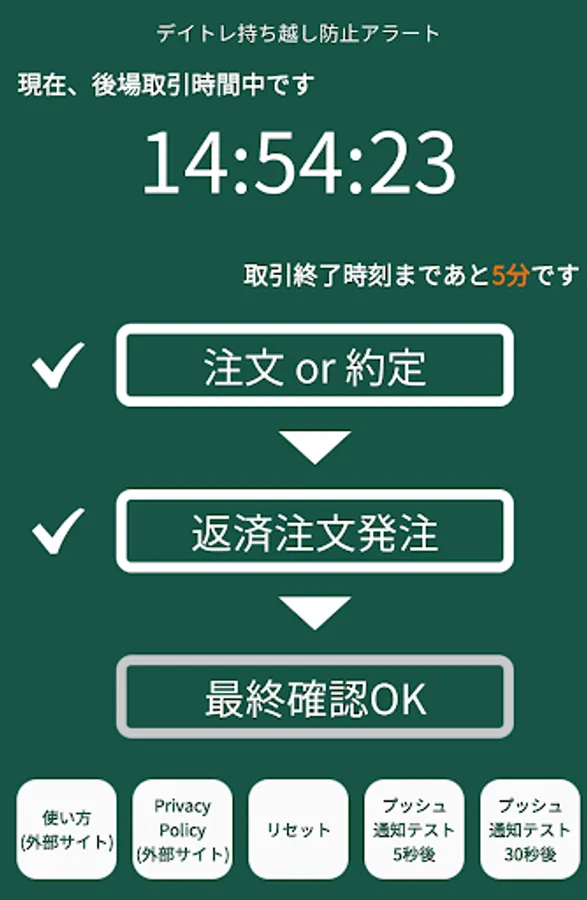 In addition to the trading start and end times of the previous and subsequent trades, the push notification will be sent to the smartphone 10 minutes before the end of the latter trade (closing).