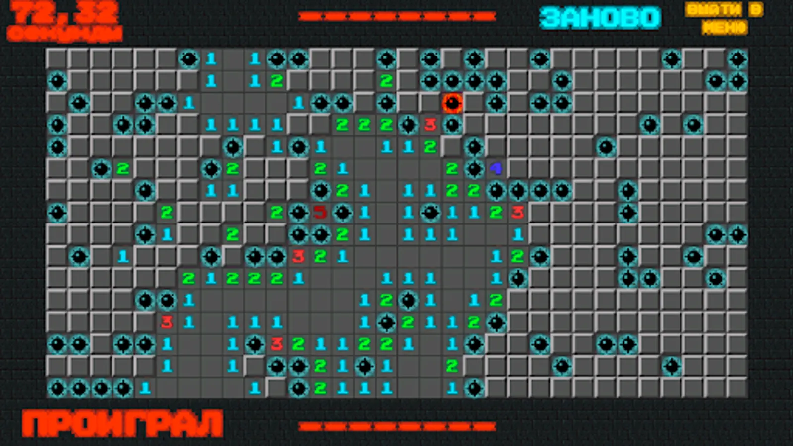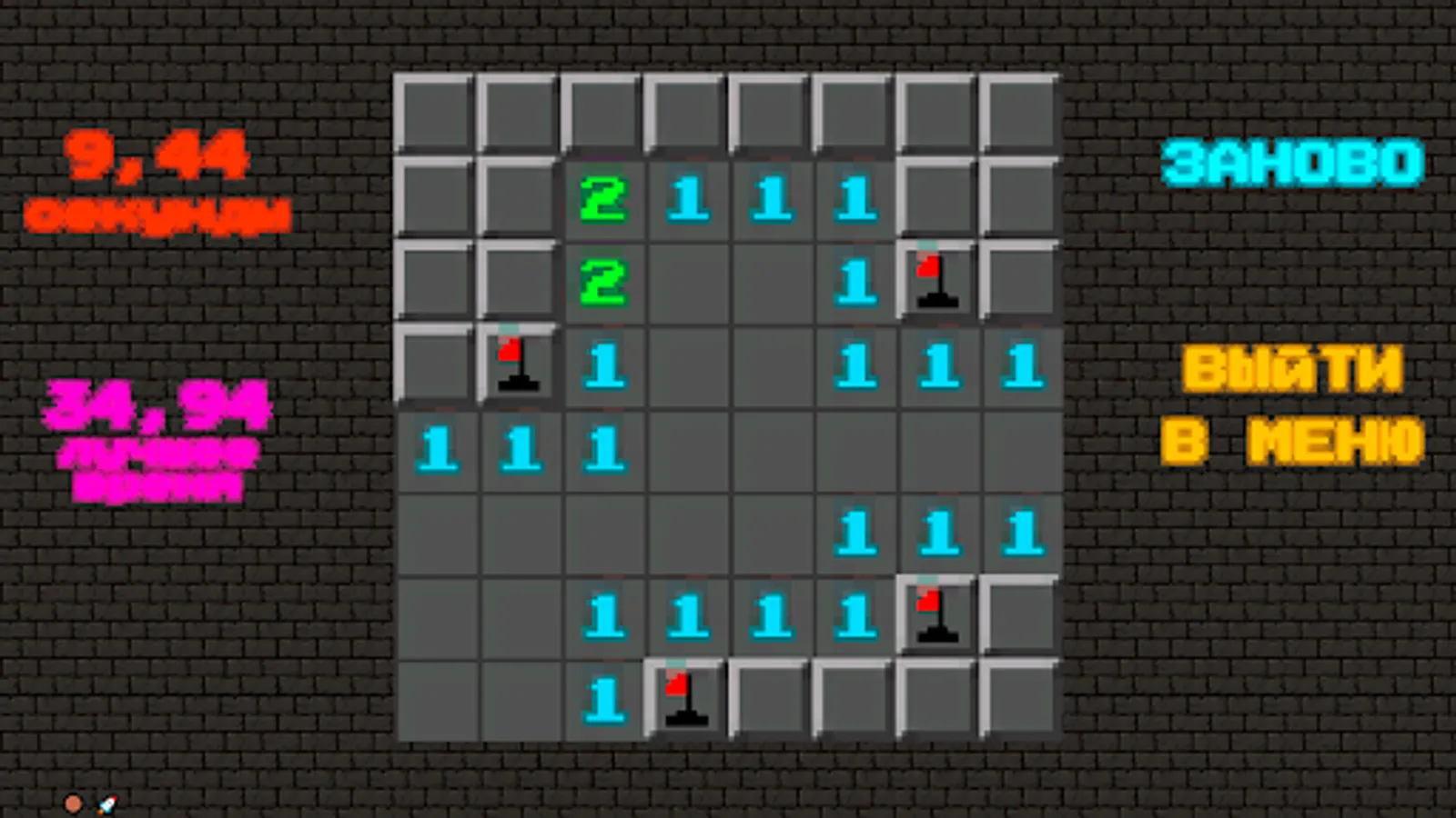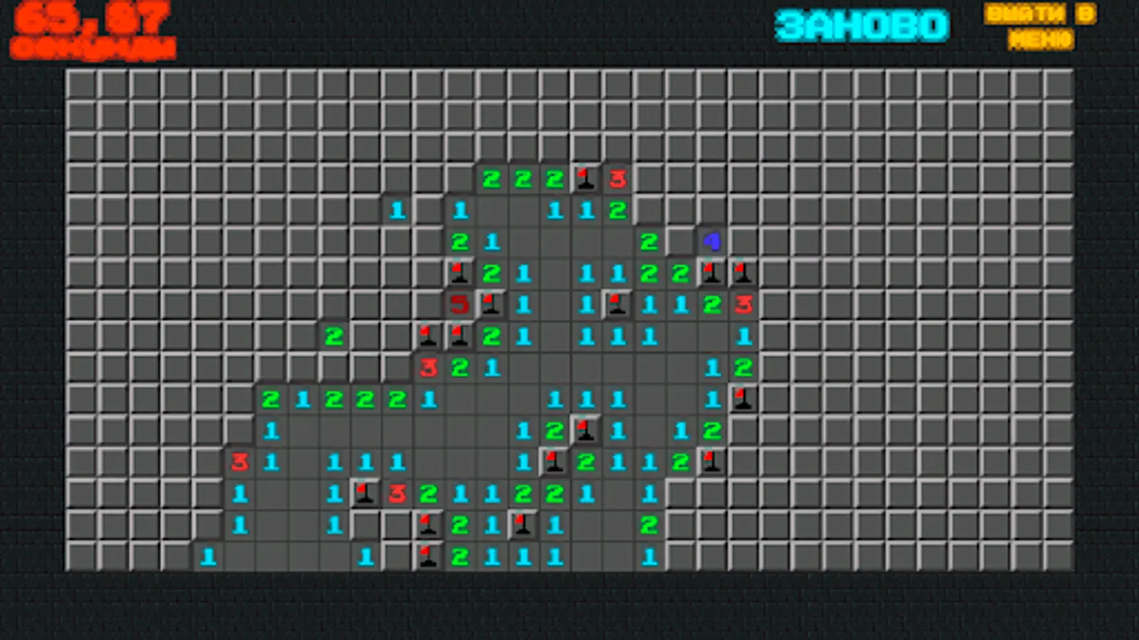 If there is no mine under the open cell, then a number appears in it, showing how many cells adjacent to the newly opened cell are “mined”; using these numbers, the player tries to calculate the location of the mines, however, sometimes even in the middle and at the end of the game, some cells still have to be opened at random.