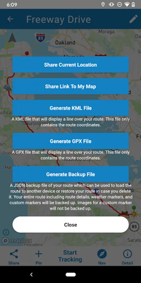 Using the export options, you can export your route to a KML, GPX, or backup file which can then be shared through any supported installed app. In addition, you can also share a link to your route. Every time you share a link to your map, your route is exported to the cloud and made available for public viewing to anyone with a link. A special link is then generated which will display your route in any web browser making it a perfect way to share your route with your friends and family.