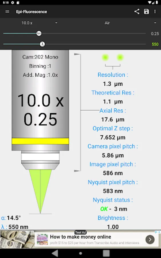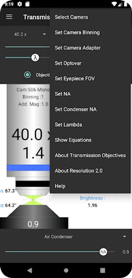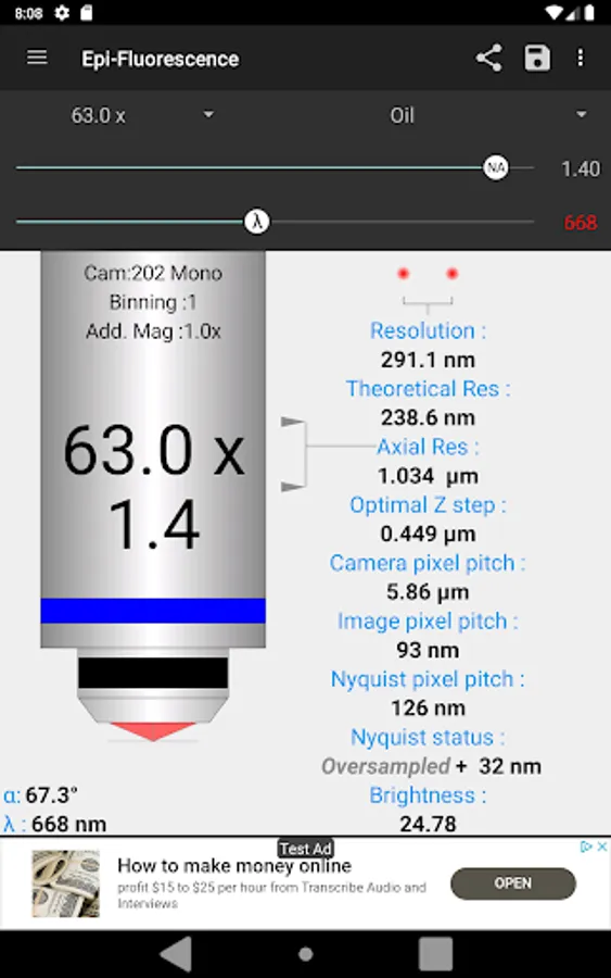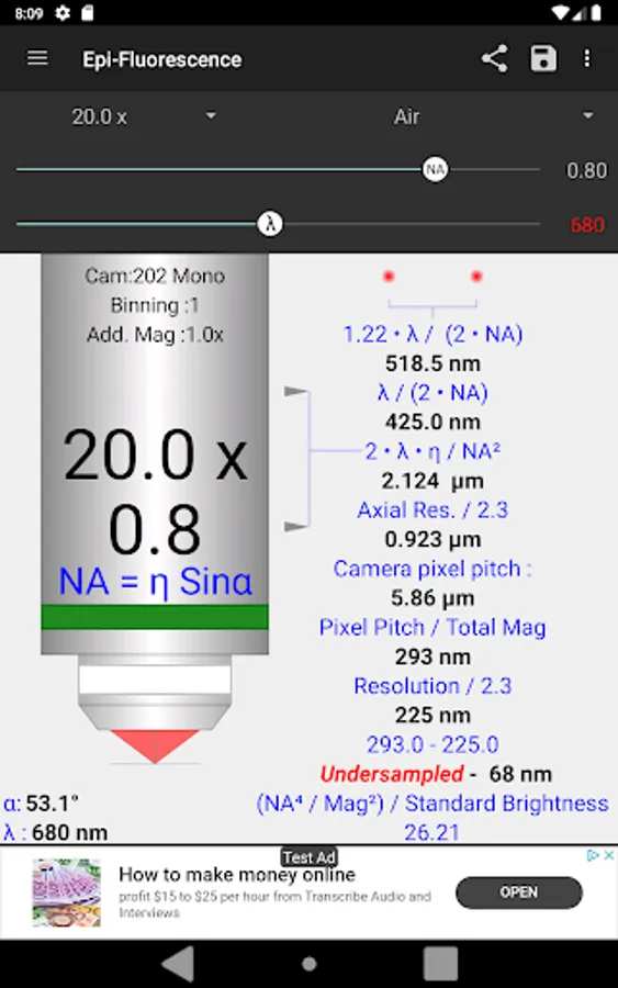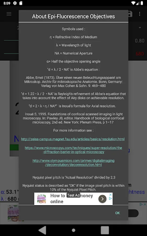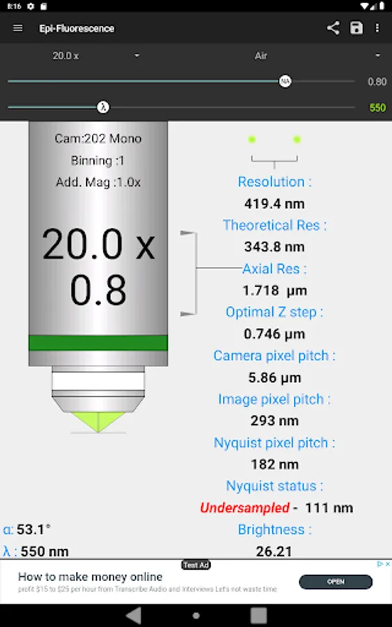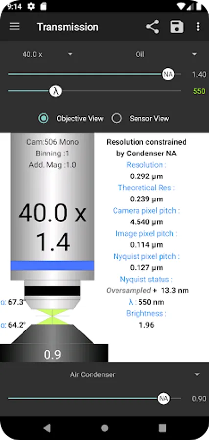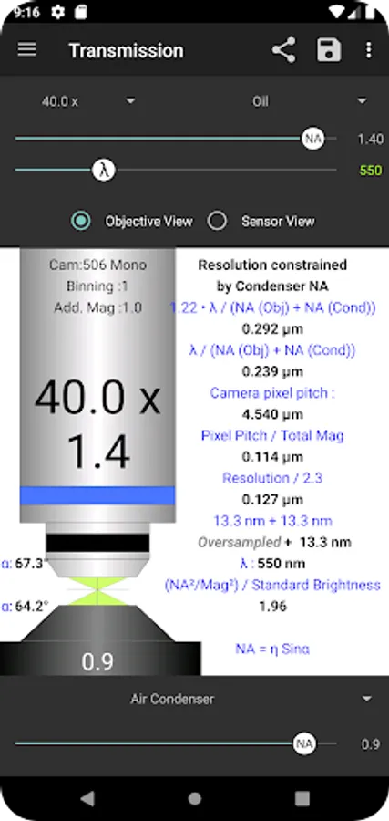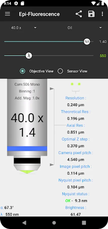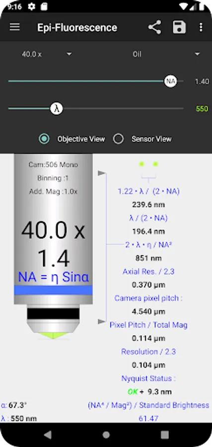 Characterize your microscope objective lenses, see how well matched they are to your microscope's image acquisition system. Input the magnification, immersion medium (air, oil, glycerol or silicone oil), NA (numerical aperture) and wavelength of light (lambda), to calculate the lateral resolution, axial resolution and fluorescence brightness of the objective. Characterize your acquisition system (camera pixel size, camera binning and additional magnification) to check if you're sampling at Nyquist frequency. Each of your objectives can be saved and easily restored, and shared with other microscopists via e-mail, MMS, Linked-In or even Facebook (why not?). The equations used for the calculations can be displayed by selecting the "Show Equations" option from the App bar menu. The sources of equations are referenced in the "About" box.