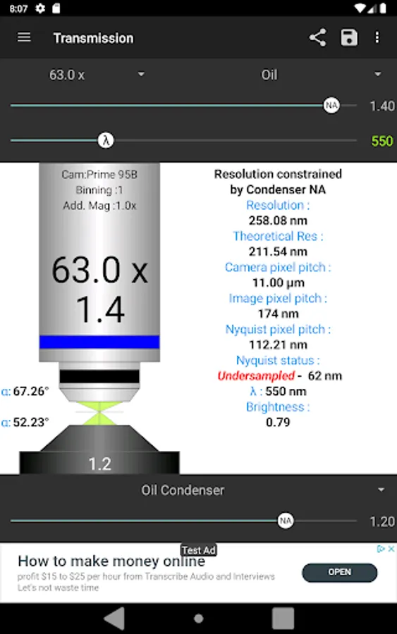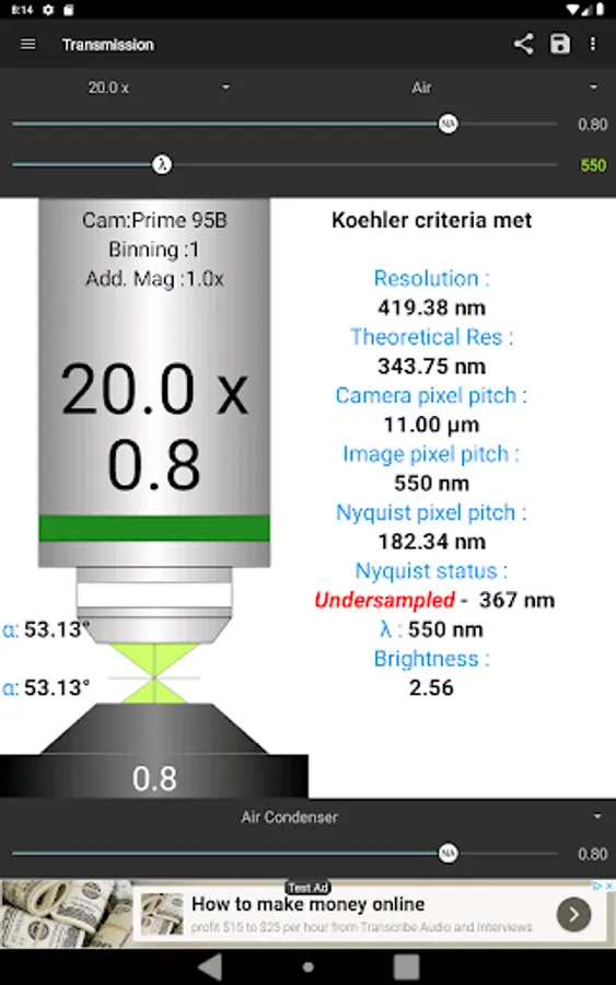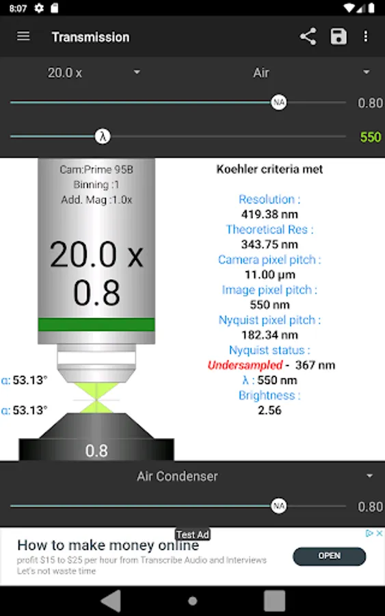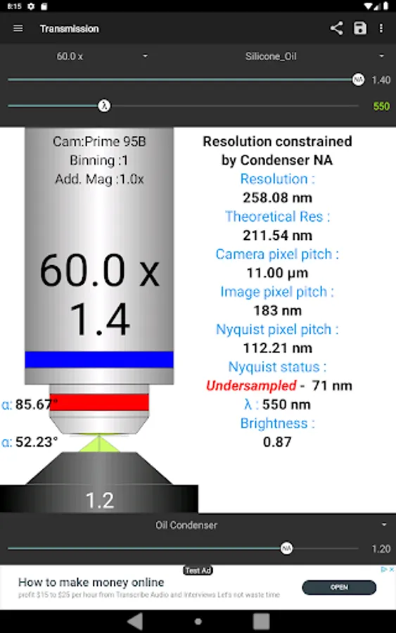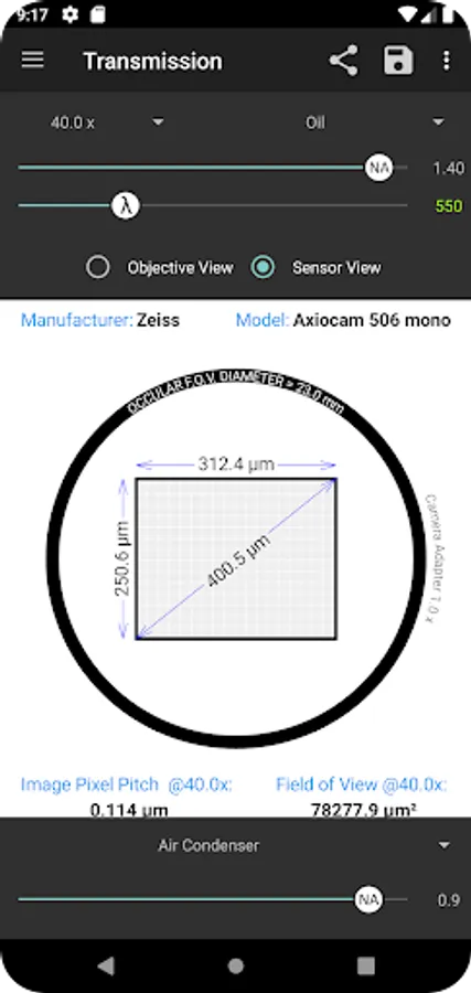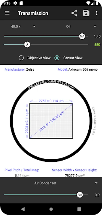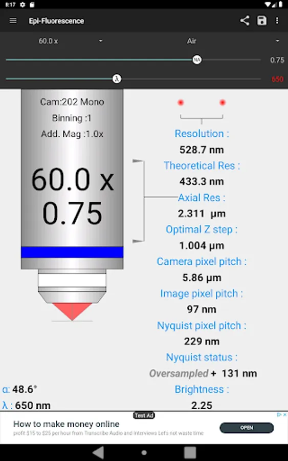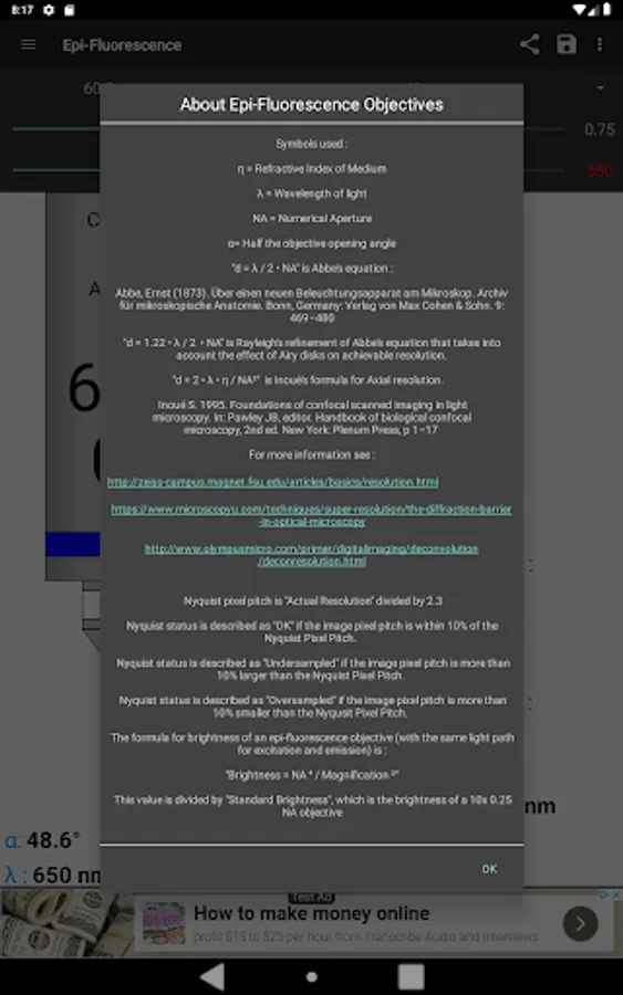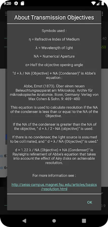 Characterize your microscope objective lenses, see how well matched they are to your microscope's image acquisition system. Input the magnification, immersion medium (air, oil, glycerol or silicone oil), NA (numerical aperture) and wavelength of light (lambda), to calculate the lateral resolution, axial resolution and fluorescence brightness of the objective. Characterize your acquisition system (camera pixel size, camera binning and additional magnification) to check if you're sampling at Nyquist frequency. Each of your objectives can be saved and easily restored, and shared with other microscopists via e-mail, MMS, Linked-In or even Facebook (why not?). The equations used for the calculations can be displayed by selecting the "Show Equations" option from the App bar menu. The sources of equations are referenced in the "About" box.