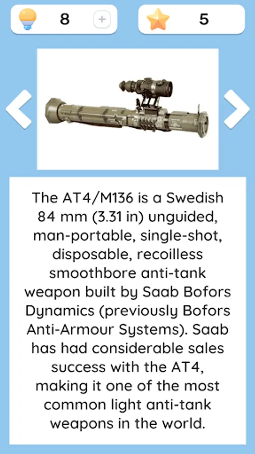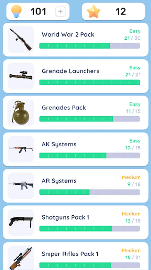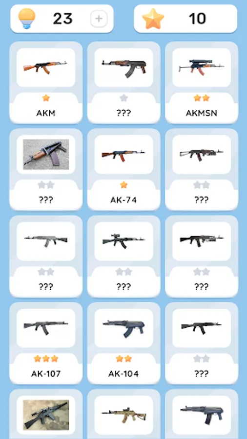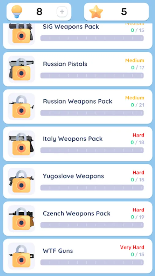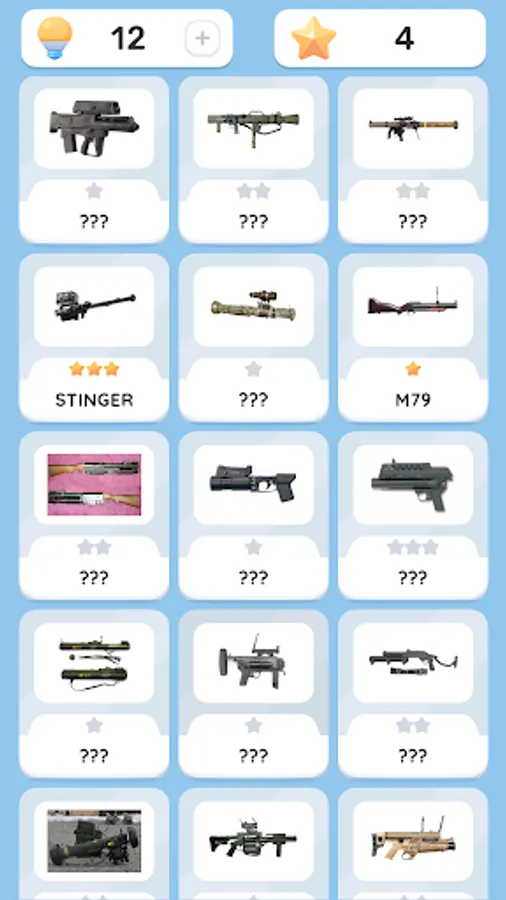 Guess different types of weapons, get stars for it and unlock new sets of weapons with them!