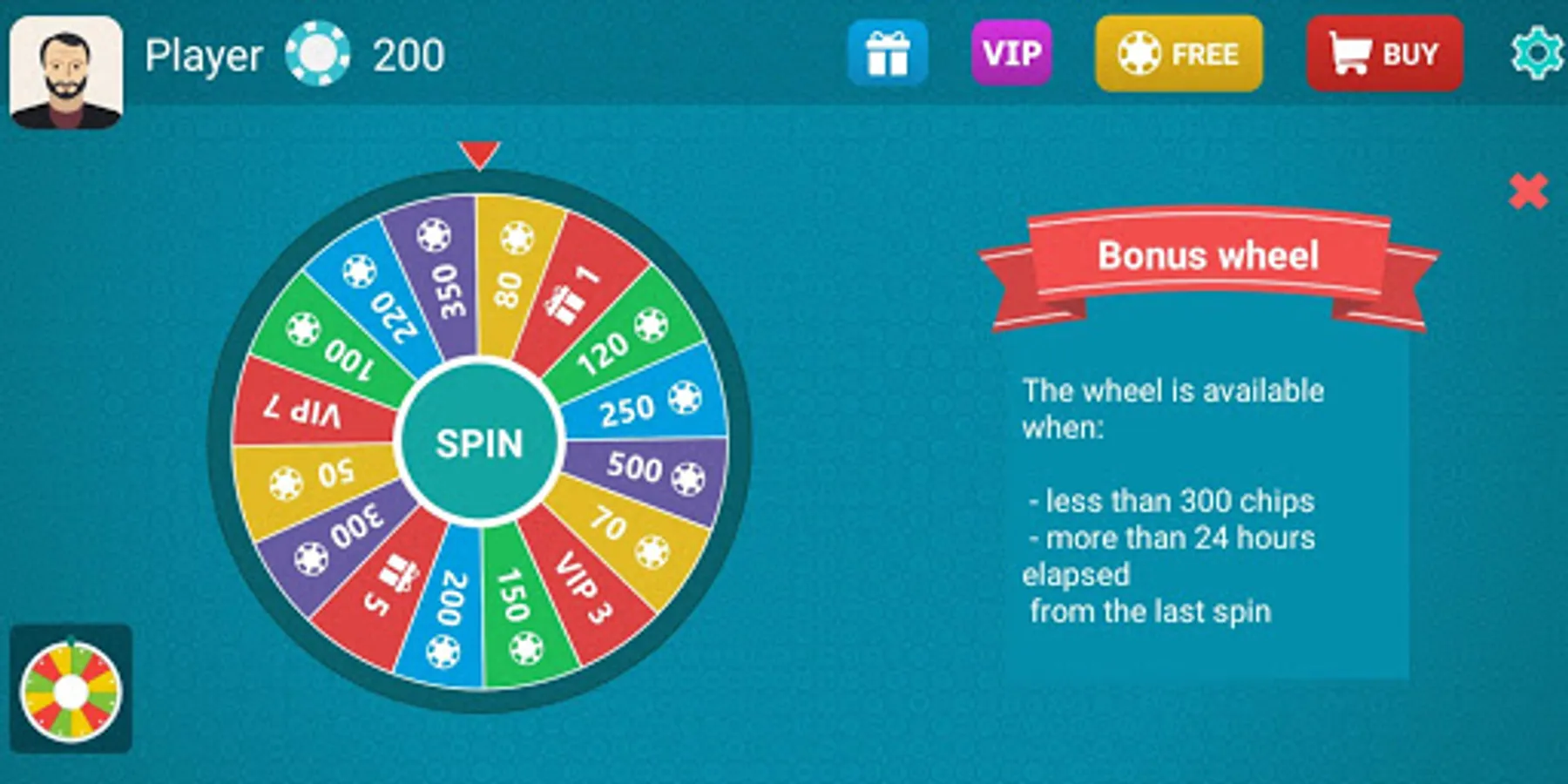 - In the absence of chips for the game, they can be replenished once a day by spinning the daily bonus wheel for free.