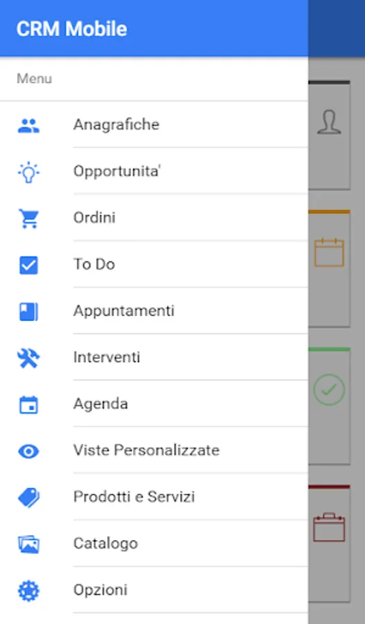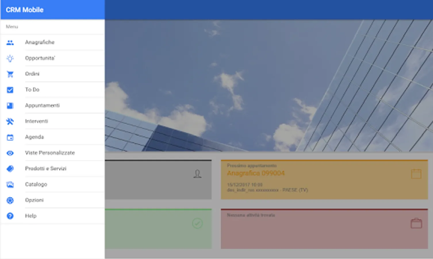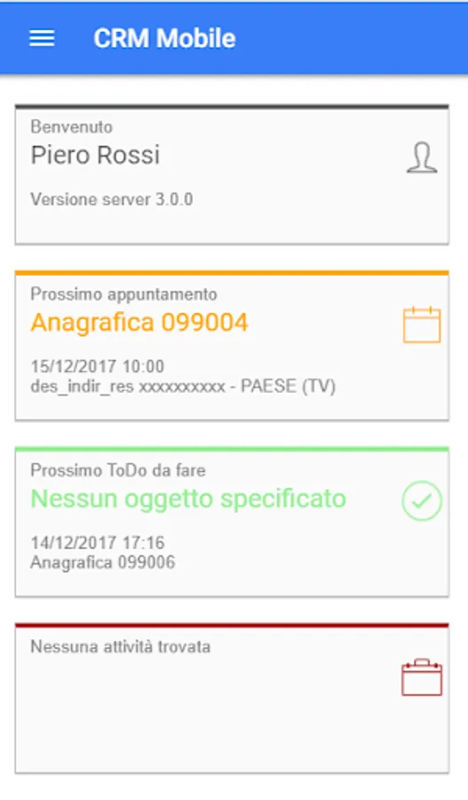 The CRM application provides the following functional modules for the operation of mobile staff. Each module is called from the menu on the left and is connected to others through context menus that allow you to easily switch from one function to another. This interconnection allows to realize the business process in a flexible in the light of the activities with the customer.
