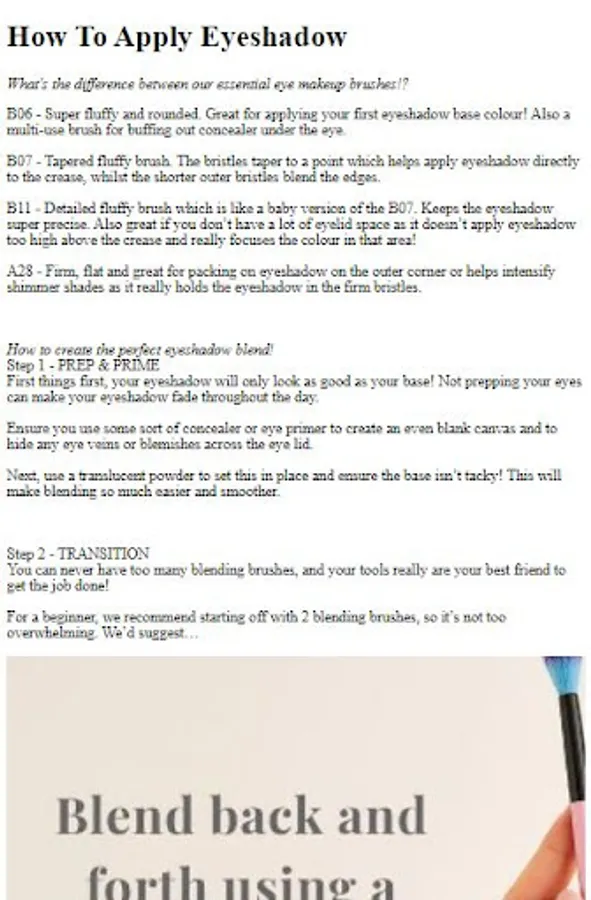 Start from the basics and build a strong foundation in eyeshadow application. Our app guides you through selecting the right eyeshadow shades for your eye color, understanding different eyeshadow finishes, and identifying the essential brushes and tools for flawless application. Gain confidence and expertise in no time!