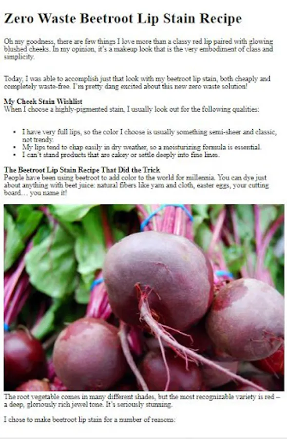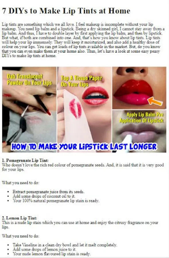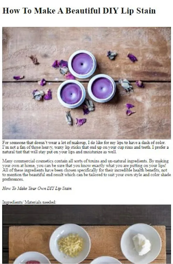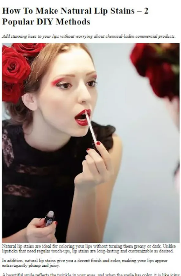 Welcome to "How to Make Natural Lip Stains," your ultimate guide to achieving beautiful, vibrant lips with the power of nature. Discover the art of creating custom lip stains using natural ingredients and unleash your inner lip artist. Whether you're passionate about eco-friendly beauty, looking for toxin-free alternatives, or simply love experimenting with colors, this app is your key to achieving gorgeous, naturally stained lips.