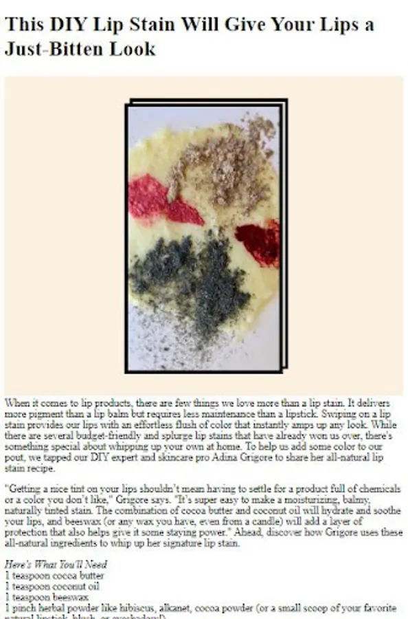 Bid farewell to artificial dyes and synthetic chemicals. Our app celebrates the beauty of nature by guiding you through a curated selection of natural ingredients for lip staining. Explore the vibrant world of plant-based pigments, from crushed berries and beetroot to cocoa powder and hibiscus petals. Unleash your inner alchemist and embrace the beauty of Mother Earth.