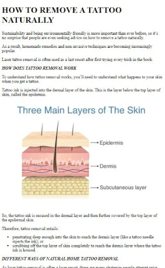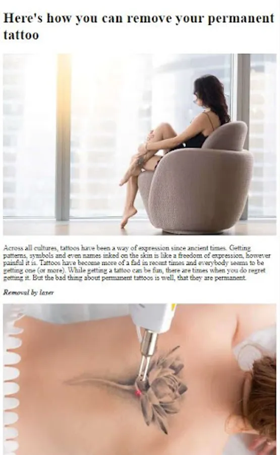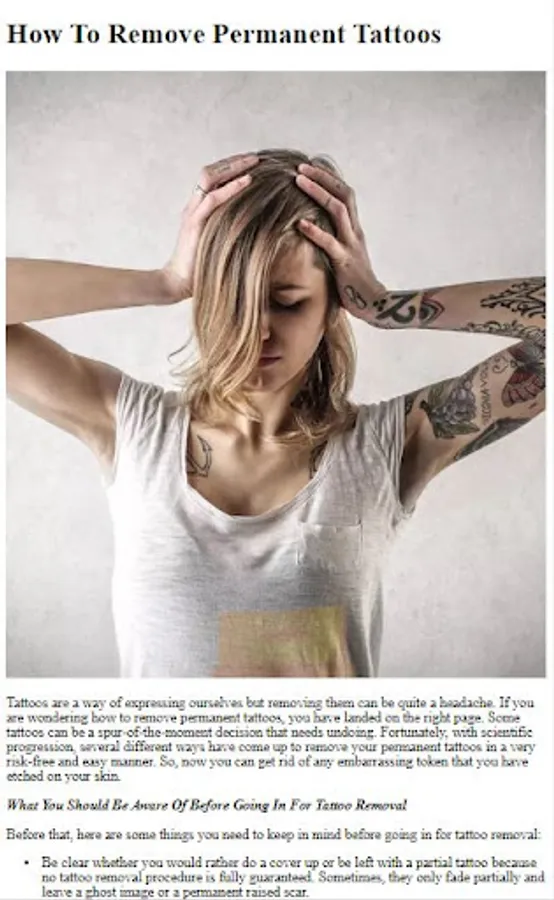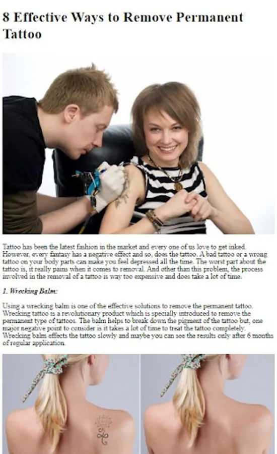 Discover the most effective methods for permanent tattoo removal. Our app explains various options, including laser tattoo removal, tattoo removal creams, and natural remedies. We provide detailed insights into each method, helping you make an informed decision about the best approach for your unique situation.